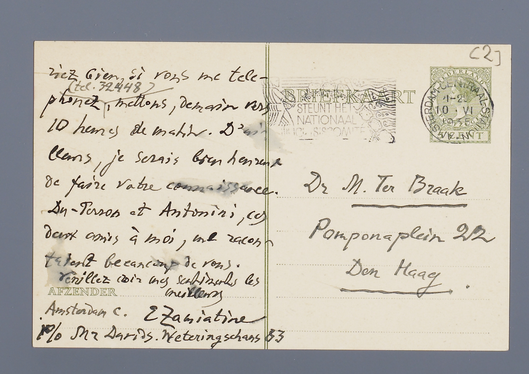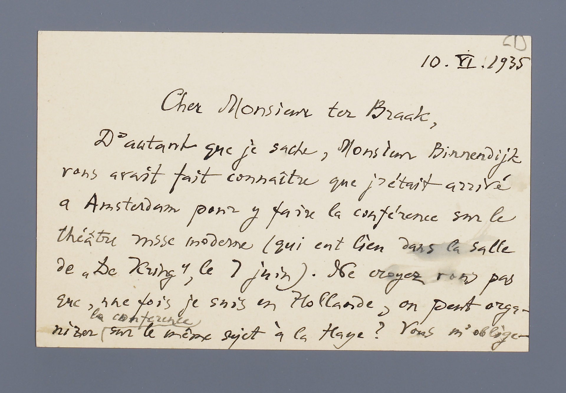 D'autant que je sache, Monsieur Binnendijk vous avait fait connaître que j’était arrivé a Amsterdam pour y faire la conférence sur le théâtre [onleesbaar] moderne (qui eut lieu dans la salle de ‘De Kring’, le 7 juin). Ne croyez vous pas que, une fois je suis en Hollande, on peut organizer la conference sur le même sujet à la Haye? Vous m'obligeriez bien si vous me telephonez (tel. 32448), mettons, demain vers 10 heures de matin.