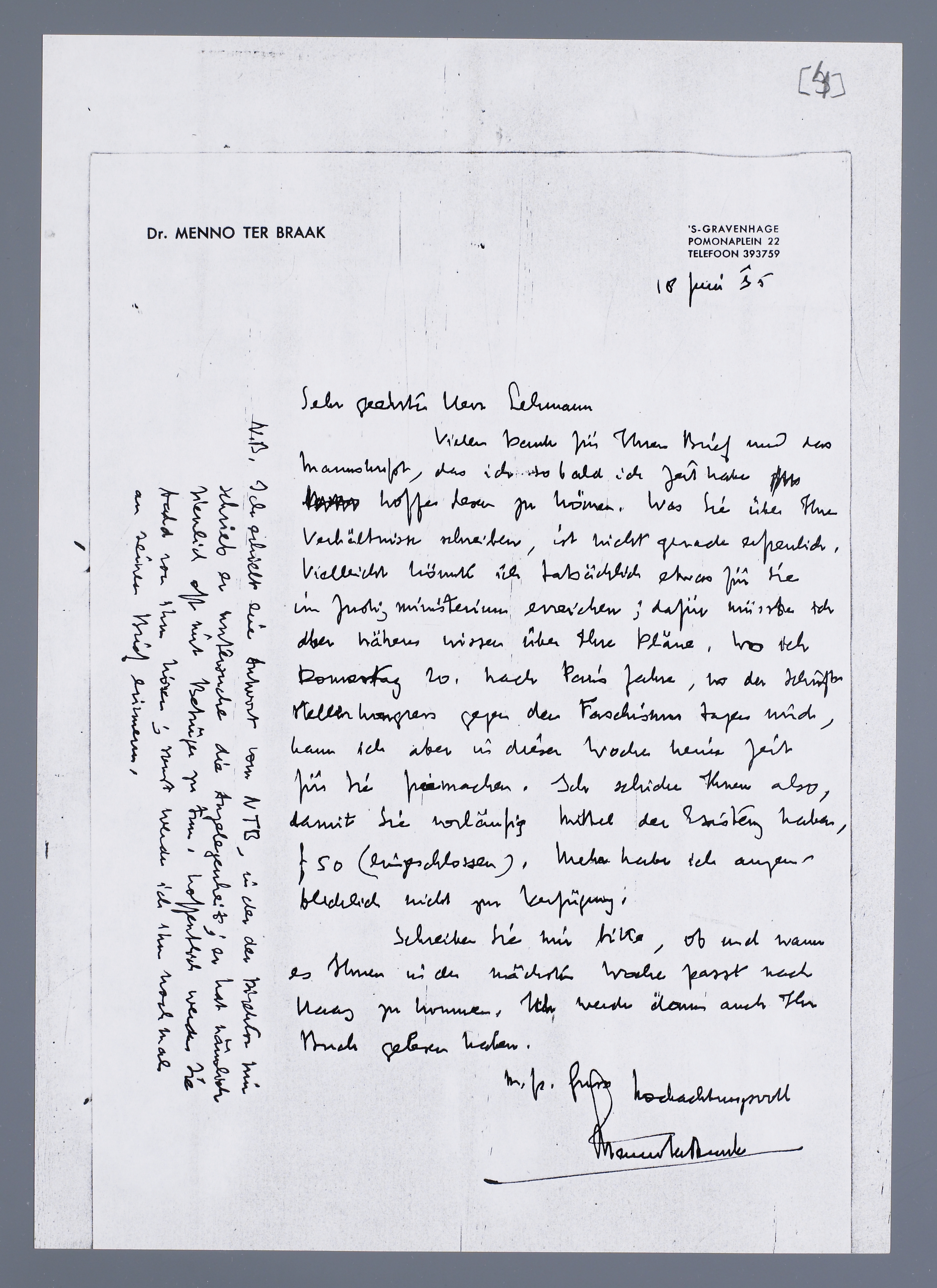 Was Sie über Ihre Verhältnisse schreiben, ist nicht gerade erfreulich. Vielleicht könnte ich tatsächlich etwas für Sie im Justizministerium erreichen; dafür müsste ich aber näheres wissen über Ihre Pläne. Wo ich Donnerstag 20. nach Paris fahre, wo der Schriftstellerkongres gegen den Faschismus tagen wird, kann ich aber in dieser Woche keine Zeit für Sie freimachen. Ich schicke Ihnen also, damit Sie vorläufig Mittel der Existenz haben, f 50 (eingeschlossen). Mehr habe ich augenblicklich nicht zur Verfügung.