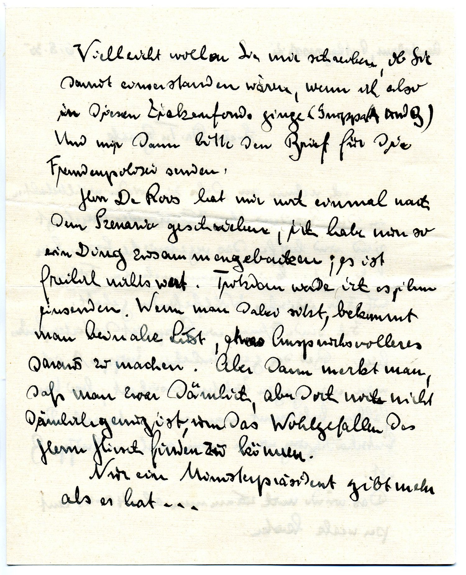 Herr De Roos hat mir noch einmal nach dem Szenario geschrieben, ich habe nun so ein Ding zusammengebacken; es ist freilich nichts wert. Trotzdem werde ich es ihm einsenden. Wenn man dabei sitzt, bekommt beinahe Lust, etwas Anspruchsvolleres daraus zu machen. Aber dann merkt man, daß man zwar dämlich, aber doch nicht dämlich genug ist, um das Wohlgefallen des Herrn Hirsch finden zu können.