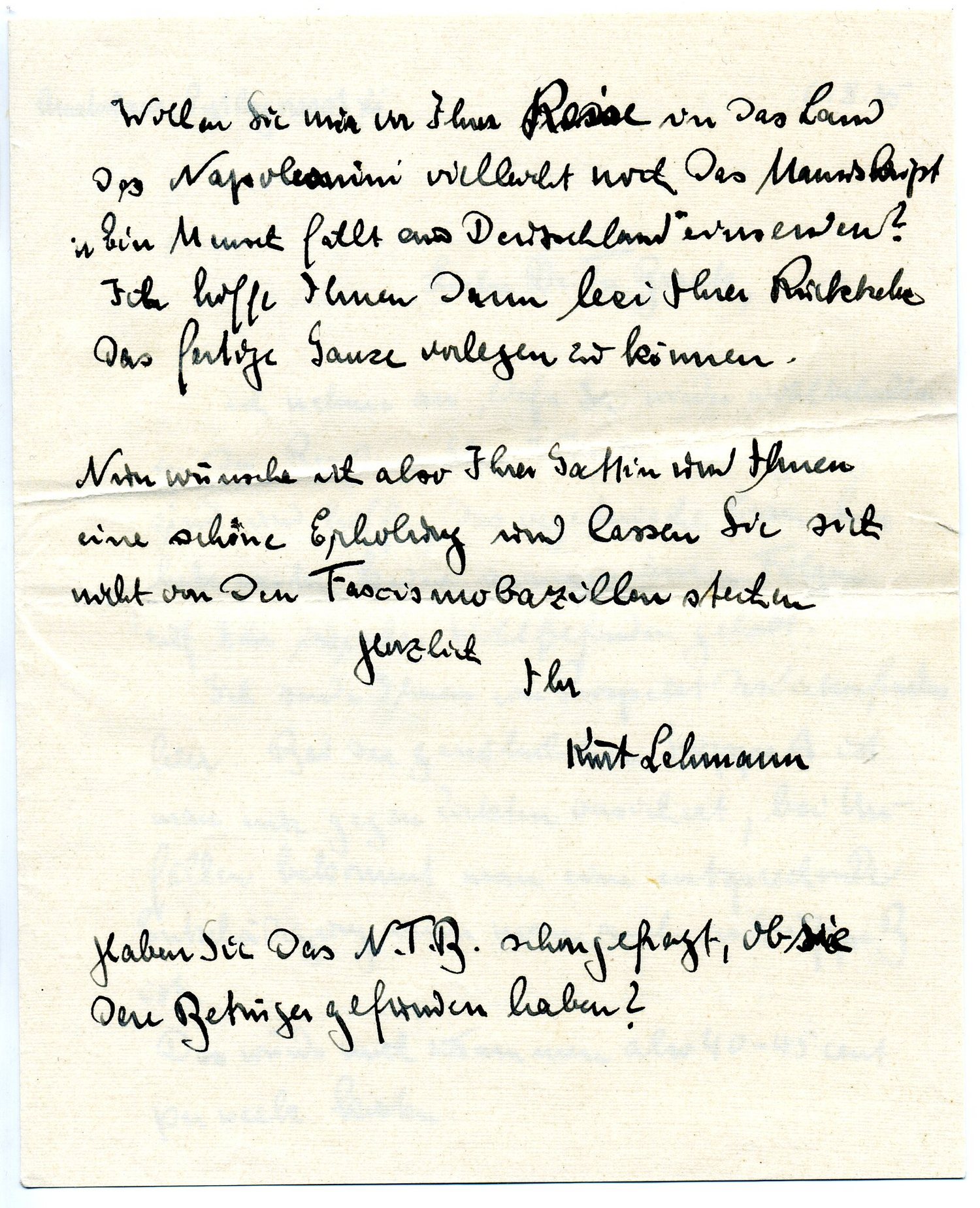 Wollen Sie mir vor Ihrer Reise in das Land der Napoleonini vielleicht noch das Manuskript Ein Mensch fällt aus Deutschland einsenden? Ich hoffe Ihnen dann bei Ihrer Rückkehr das fertige Ganze vorlegen zu können.
