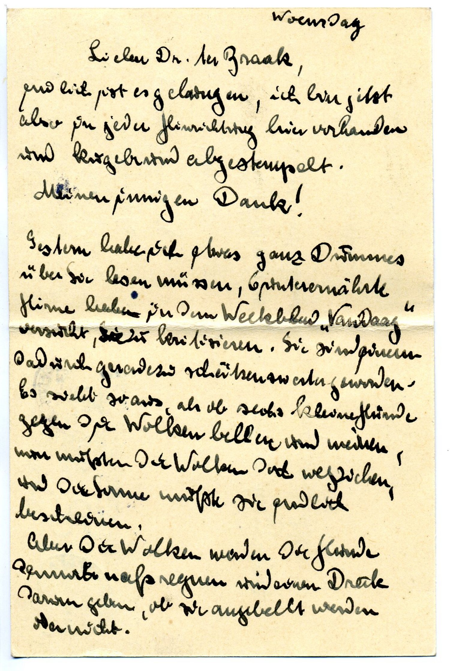 Gestern habe ich etwas ganz Dummes über Sie lesen müssen, 6 unterernährte Hirne haben in dem Weekblad Vandaag versucht, Sie zu kritisieren. Sie sind einem dadurch geradezu schützenswerter geworden. Es sieht so aus, als ob sechs kleine Hunde gegen die Wolken bellen und meinen, nun müßten die Wolken dort wegziehen, und die Sonne müsste sie endlich bescheinen.