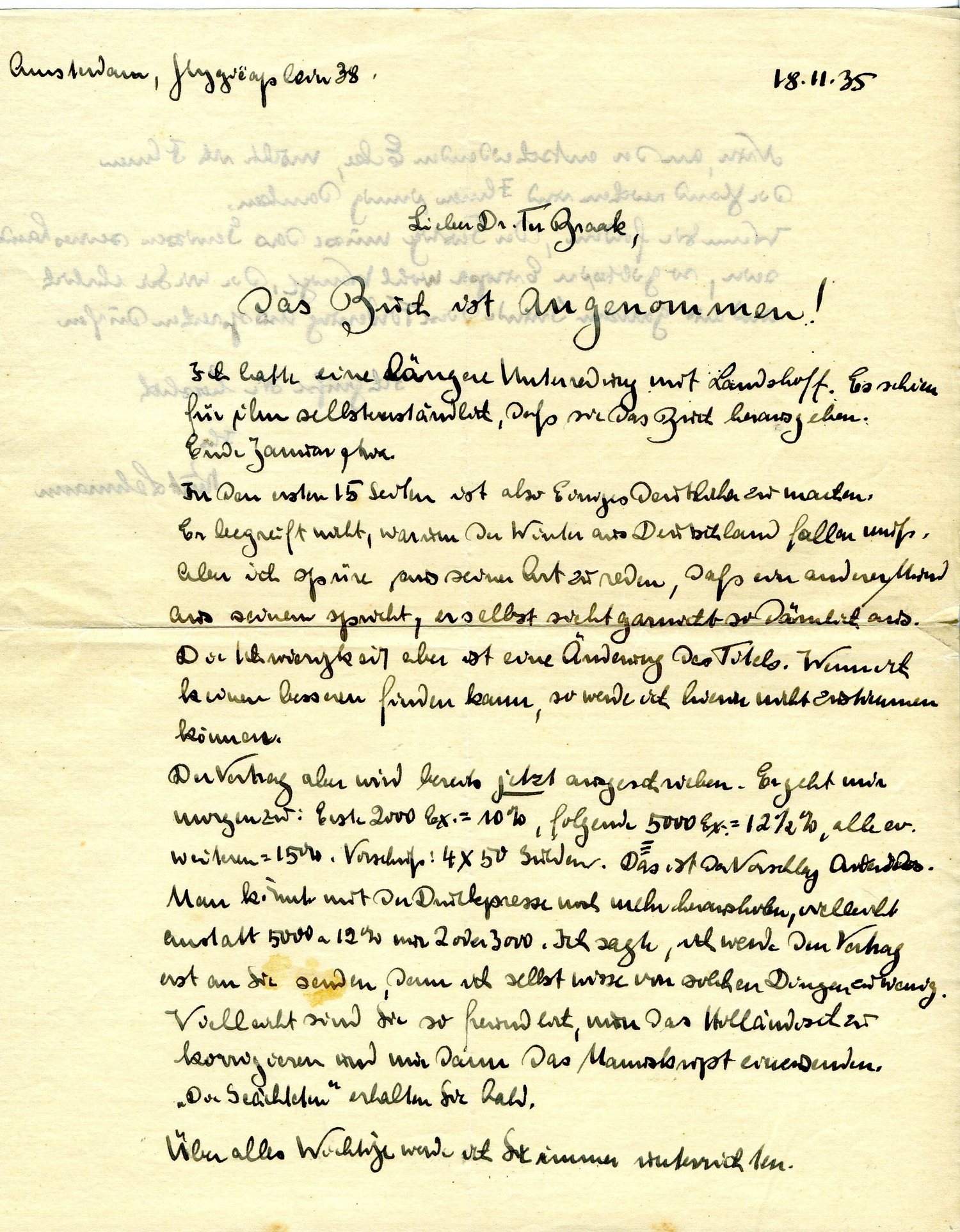 Man könnte mit der Druckpresse noch mehr herausholen, vielleicht anstatt 5000 a 12% nur 2 oder 3000. Ich sagte, ich werde den Vertrag erst an Sie senden, denn ich selbst wisse von solchen Dingen zu wenig. Vielleicht sind Sie so freundlich, nun das Holländische zu korrigieren und mir dann das Manuskript einzusenden. Die Geächteten erhalten Sie bald.