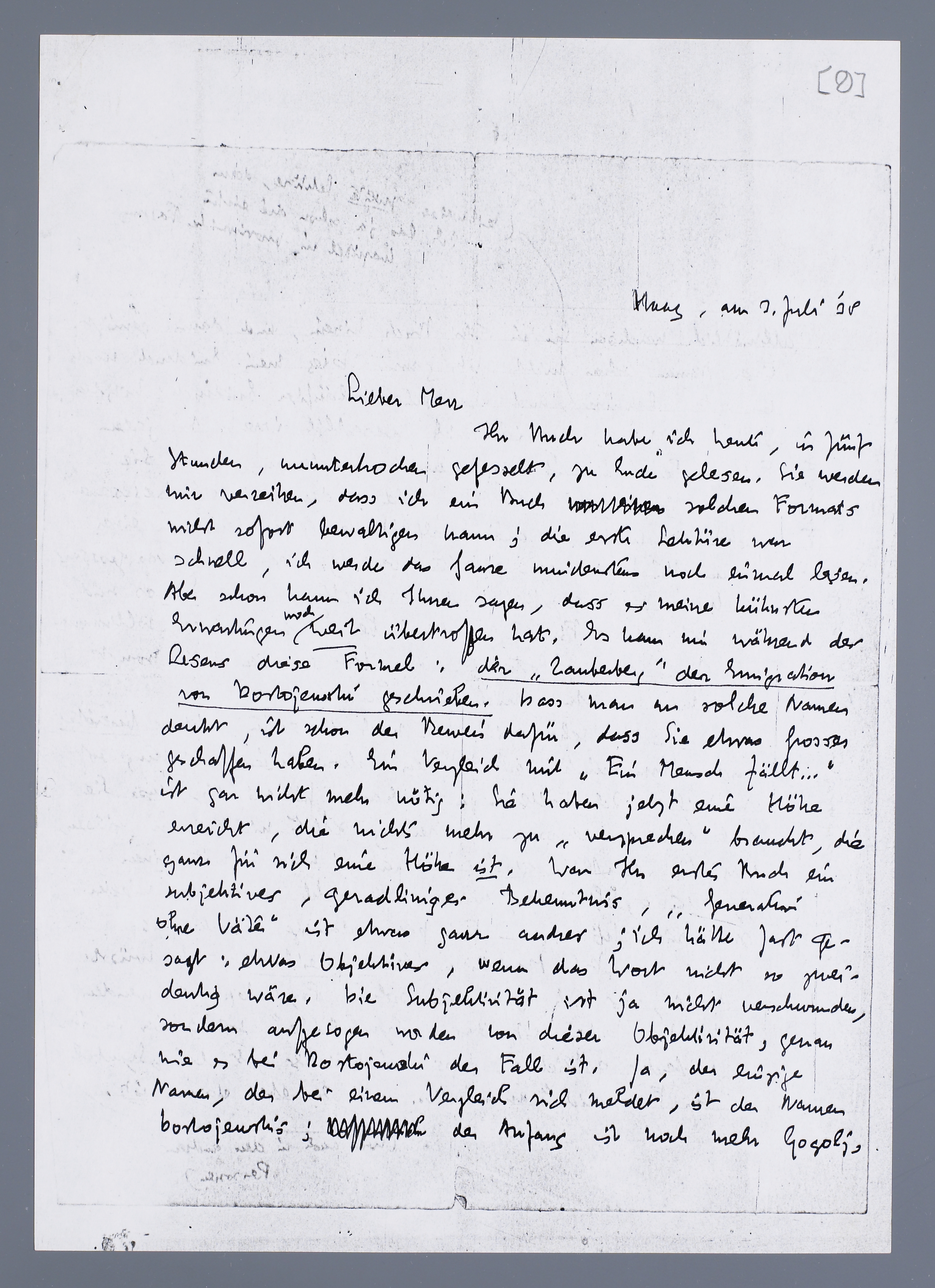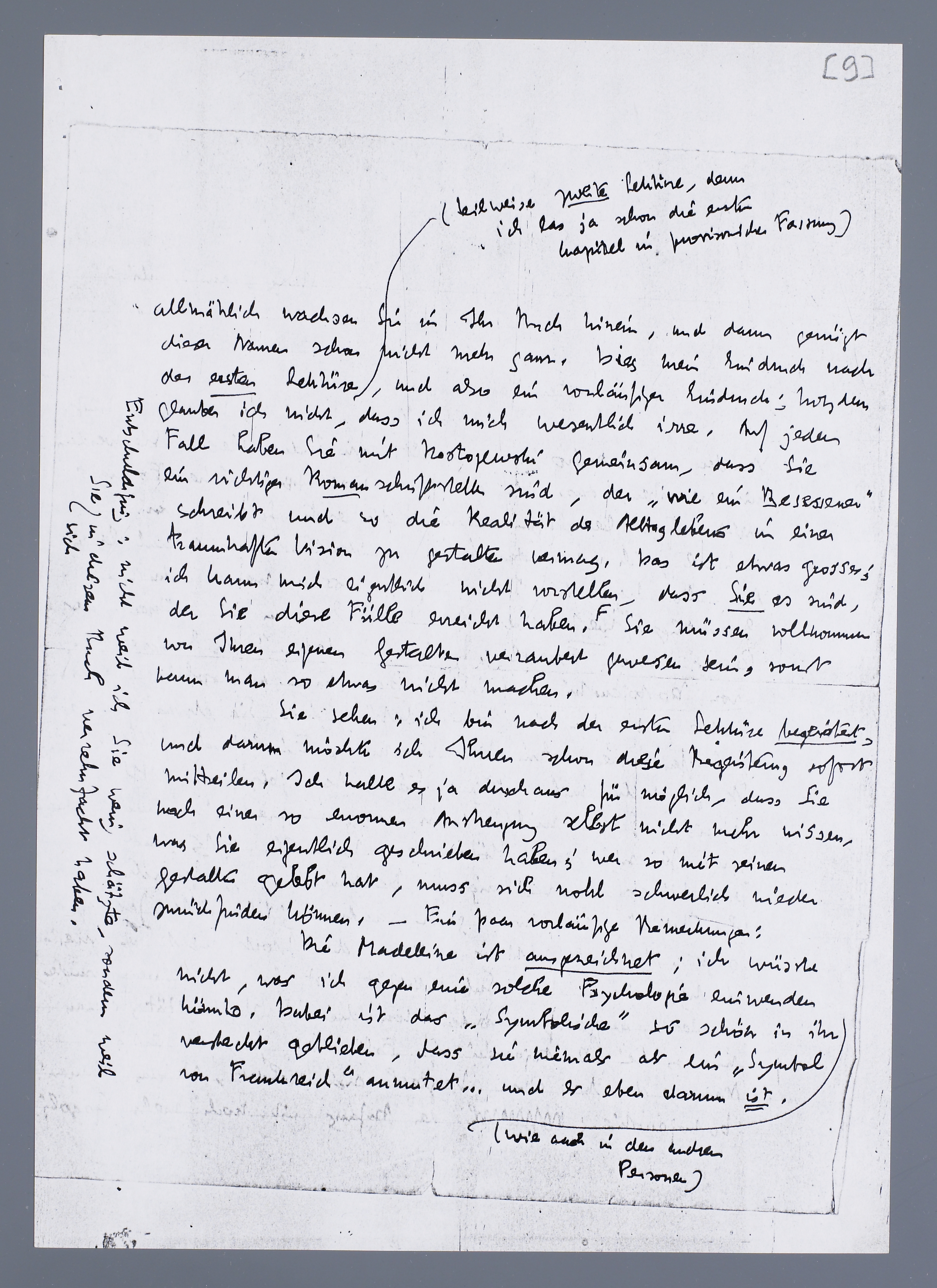 Sie sehen: ich bin nach der ersten Lektüre begeistert, und darum möchte ich Inhnen schon diese Begeisterung sofort mitteilen. Ich halte es ja durchaus für möglich, dass Sie nach einer so enormen Anstrengung selbst nicht mehr wissen, was Sie eigentlich geschrieben haben; wer so mit seinen Gestalten gelebt hat, muss sich wohl schwerlich wieder zurückfinden können.- Ein paar vorläufige Bemerkungen:
