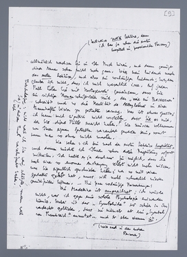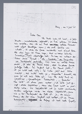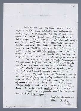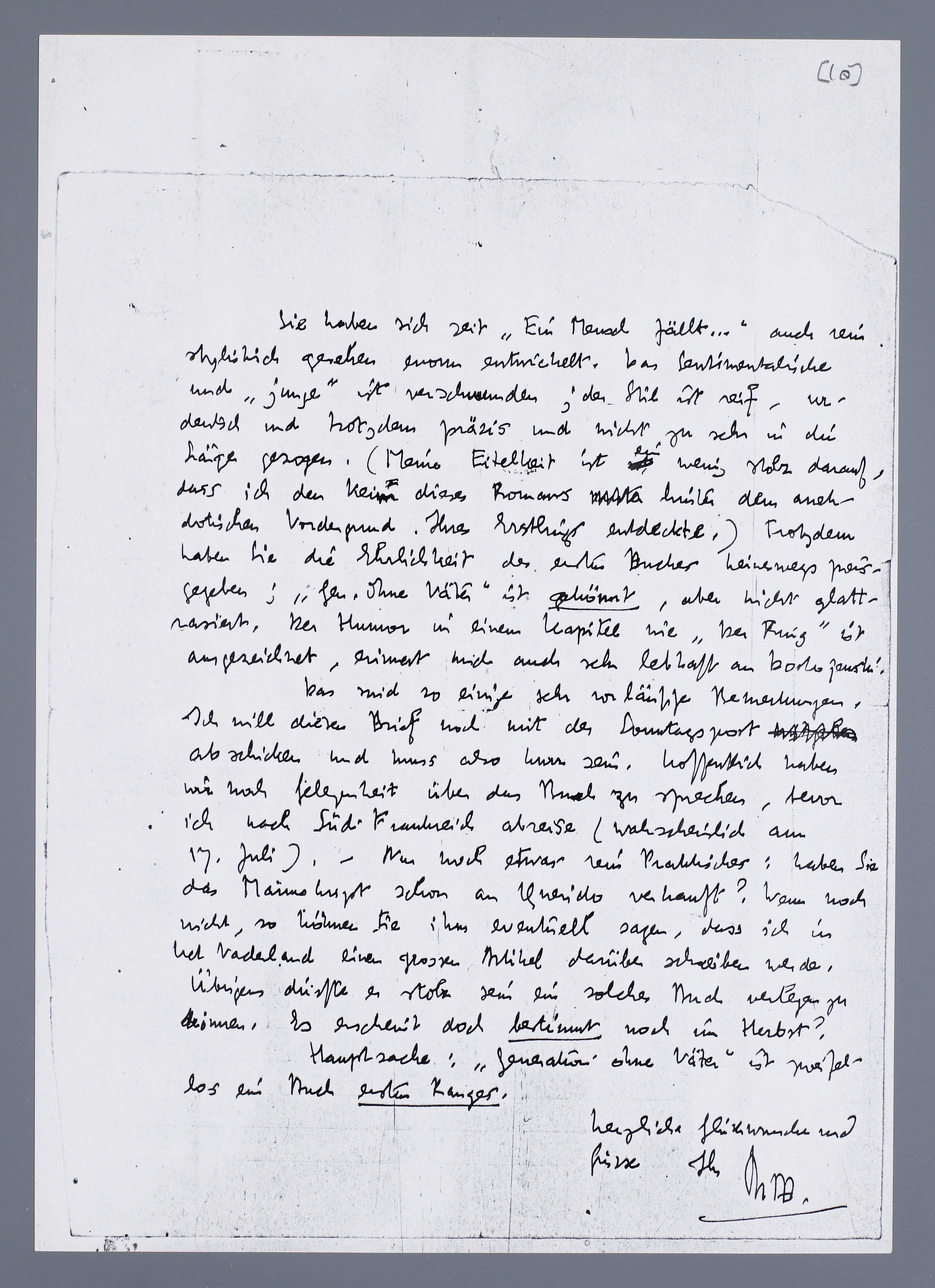 Sie haben sich seit ‘Ein Mensch fällt...’ auch rein stylistisch gesehen enorm entwickelt. Das sentimentalische und ‘junge’ ist verschwunden; der Stil ist reif, urdeutsch und trotzdem präzis und nicht zu sehr in die Länge gezogen. (Meine Eitelkeit ist ein wenig stolz darauf, dass ich den Keim dieses Romans hinter dem anekdotischen Vordergrund. Ihres Erstlings entdeckte.) Trotzdem haben Sie die Ehrlichkeit des ersten Buches keineswegs preisgegeben; ‘Gen. ohne Väter’ ist [gekönnt?], aber nicht glattrasiert. Der Humor in einem Kapitel wie ‘Der Ring’ ist ausgezeichnet, erinnert mich auch sehr lebhaft an Dostojewski.