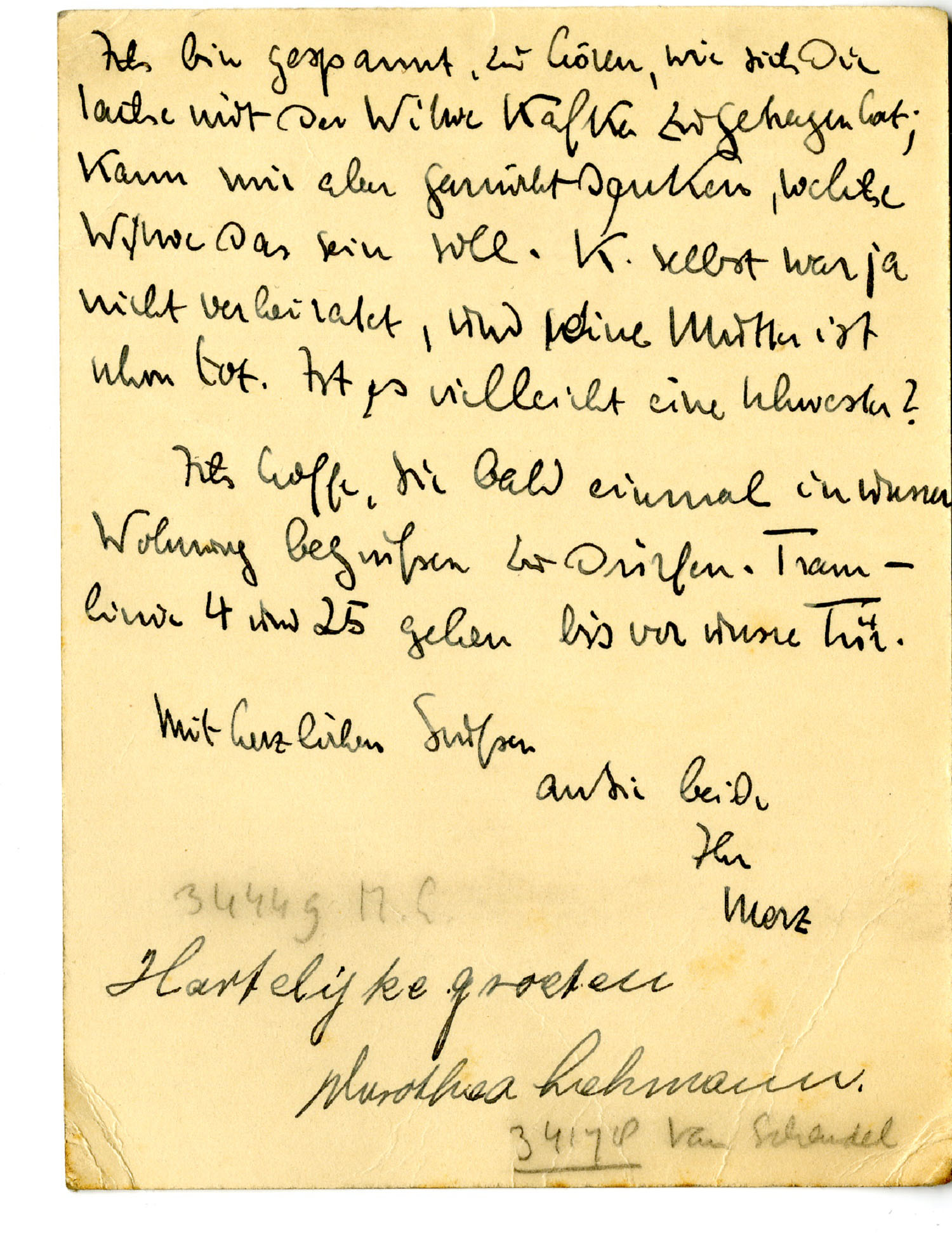 Ich bin gespannt, zu hören, wie sich die Sache mit der Witwe Kafka zugetragen hat; kann mir aber gar nicht denken, welche Witwe das sein soll. K. selbst war ja nicht verheiratet, und seine Mutter ist schon tot. Ist es vielleicht eine Schwester?