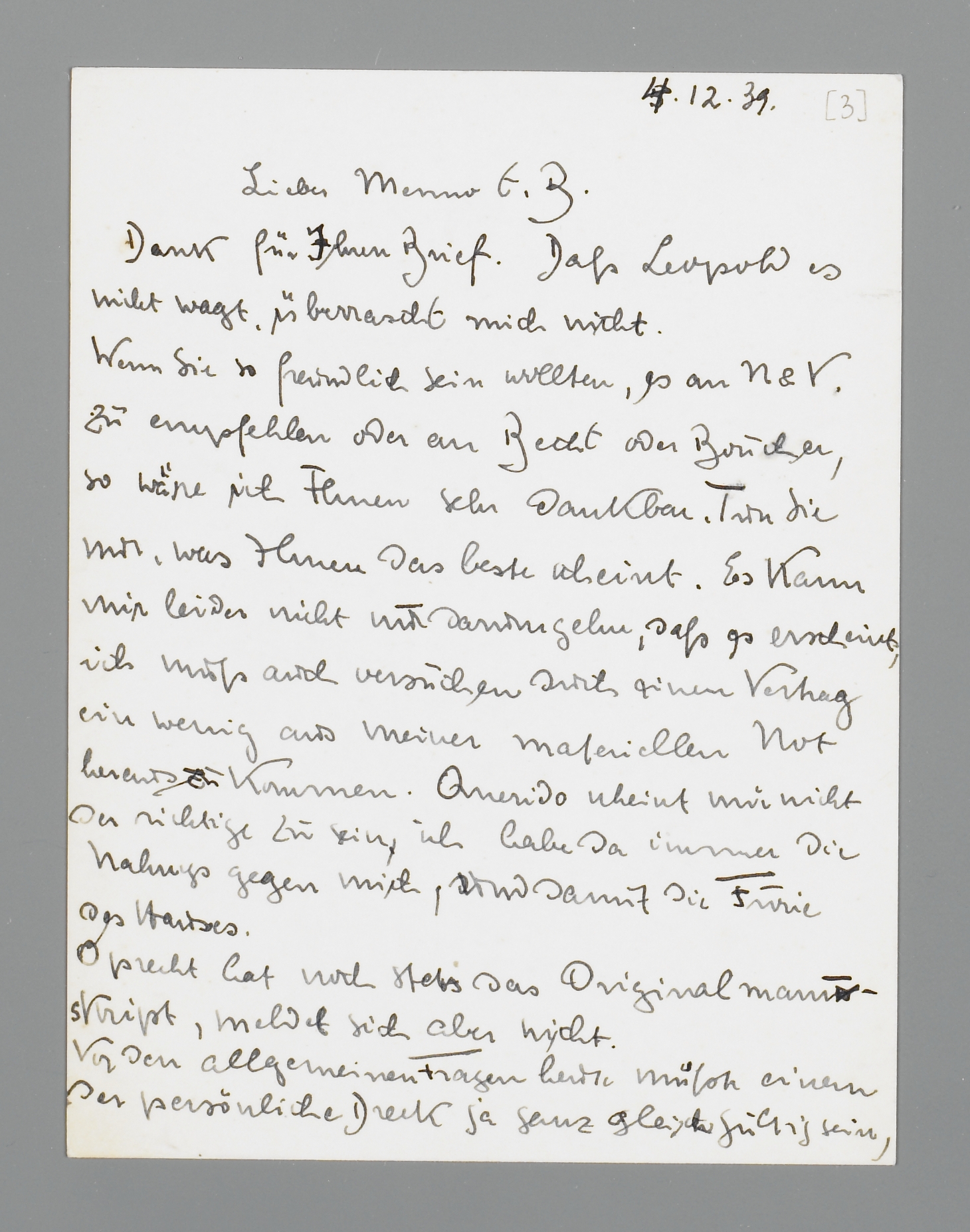 Wenn Sie so freundlich sein wollten, es an N & V zu empfehlen, oder an Becht oder Boucher, so wäre ich Ihnen sehr dankbar. Tun Sie nur was Ihnen das beste scheint. Es kann mir leider nicht nur darum gehen, dass es erscheint; ich muss auch versuchen durch einen Vertrag ein wenig aus meinen materiellen Not zu kommen. Querido scheint mir nicht der richtige zu sein, ich habe da immer die Nahuys gegen mich, und damit die Furie des Hauses.