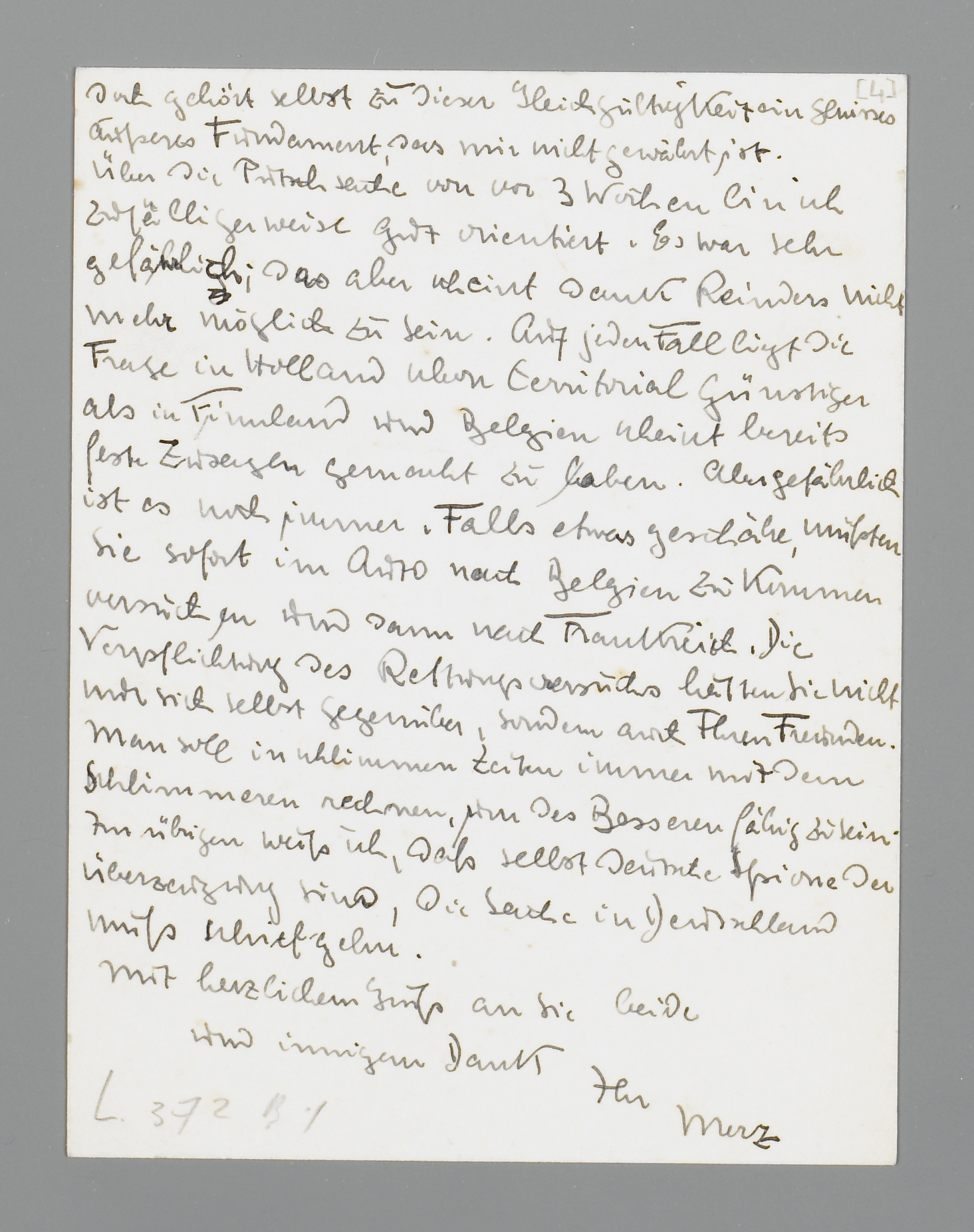 Über die Putschsache von vor 3 Wochen bin ich zufälligerweise gut orientiert. Es war sehr gefährlich; das aber scheint dank Reinders nicht mehr möglich zu sein. Auf jeden Fall liegt die Frage in Holland schon Territorial günstiger als in Finnland und Belgien scheint bereits feste Zusagen gemacht zu haben. Aber gefährlich ist es noch immer. Falls etwas geschähe, müssen Sie sofort im Auto nach Belgien zu kommen versuchen und dann nach Frankreich. Die Verplichtung des Rettungsversuches haben Sie nicht nur sich selbst gegenüber, sondern auch Ihren Freunden. Man soll in schlimmen Zeiten immer mit dem schlimmeren rechnen, um das Besseren fähig zu sein.