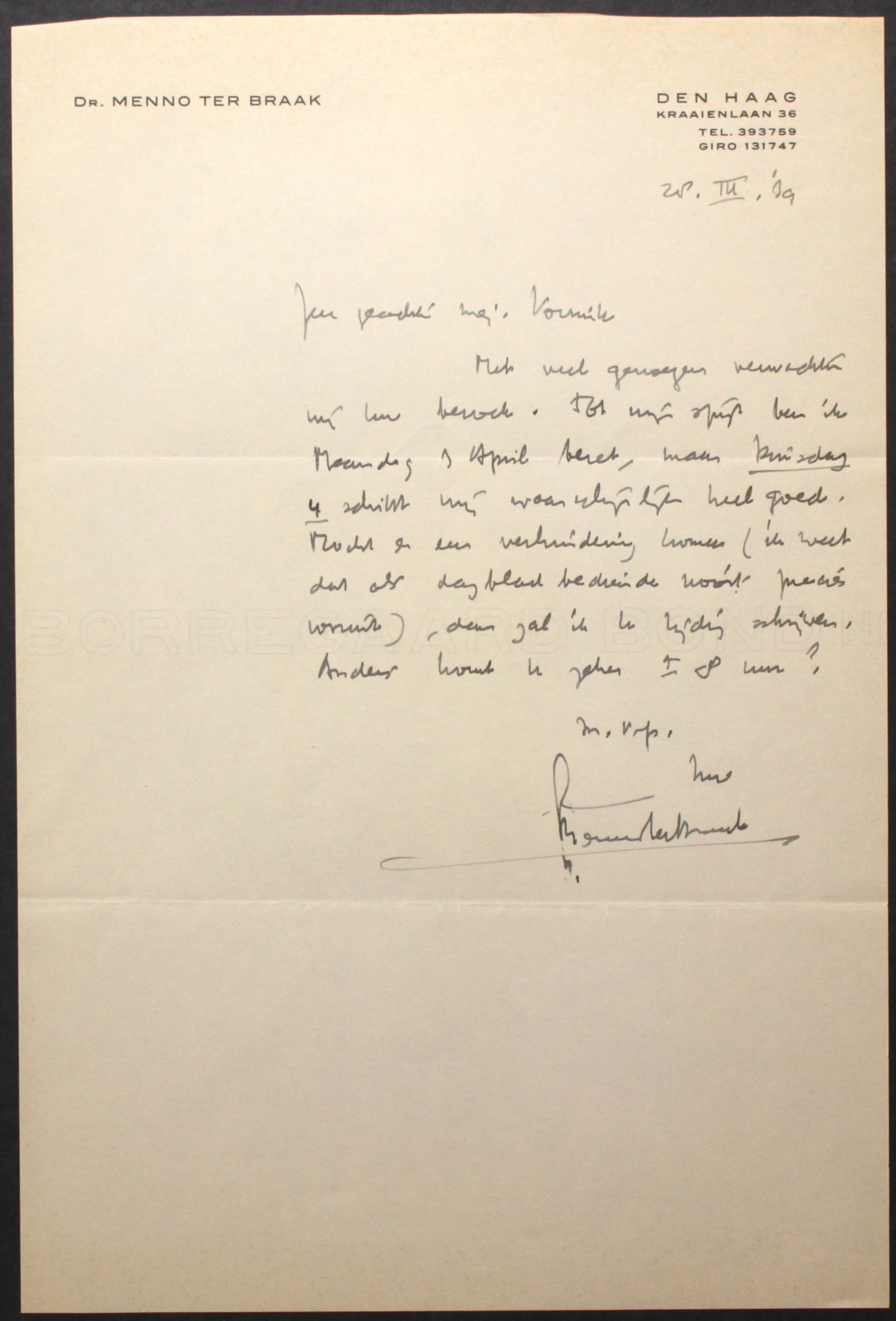 Met veel genoegen verwachten wij Uw bezoek. Tot mijn spijt ben ik Maandag 3 April bezet, maar Dinsdag 4 schikt mij waarschijnlijk heel goed. Mocht er een verhindering komen (ik weet dat als dagbladbediende nooit precies vooruit), dan zal ik U tijdig schrijven.