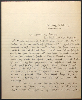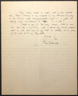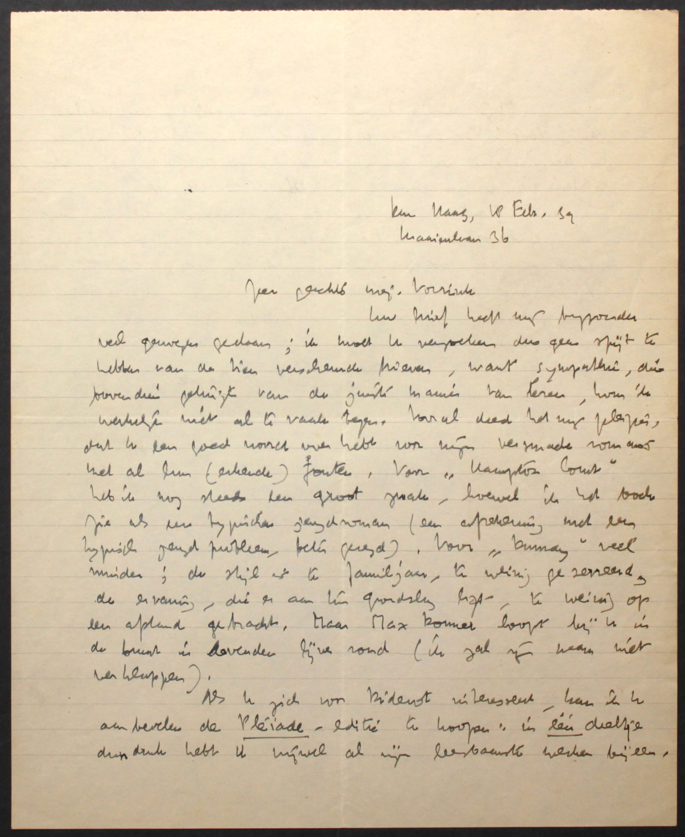 Uw brief heeft mij bijzonder veel genoegen gedaan; ik moet U verzoeken dus geen spijt te hebben van de vier verscheurde brieven, want sympathie, die bovendien getuigt van de juiste manier van lezen, kom ik werkelijk niet al te vaak tegen. Vooral deed het mij pleizier, dat U een goed woord over hebt voor mijn versmade romans met al hun (erkende) fouten. Voor ‘Hampton Court’ heb ik nog steeds een groot zwak, hoewel ik het boek zie als een typische jeugdroman (een afrekening met een typisch jeugdprobleem, beter gezegd). Voor ‘Dumay’ veel minder; de stijl is te familjaar, te weinig geserreerd, de ervaring, die er aan ten grondslag ligt, te weinig op een afstand gebracht. Maar Max Donner loopt bij U in de buurt in levenden lijve rond (ik zal zijn naam niet verklappen).