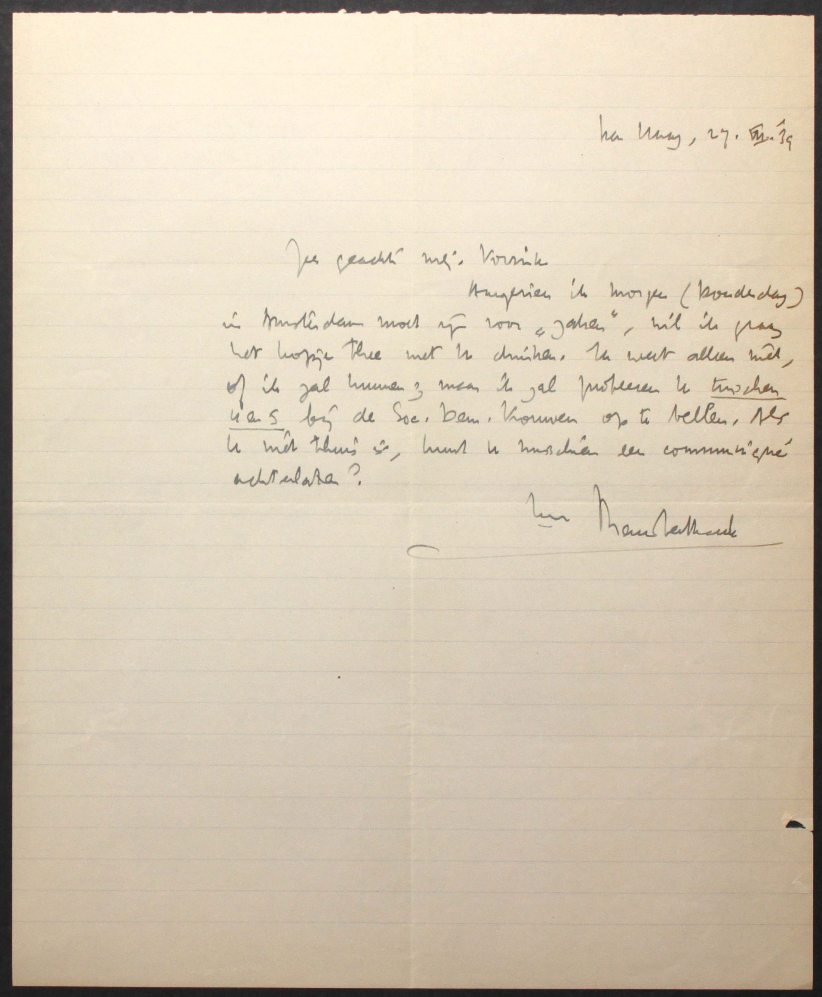 Aangezien ik morgen (Donderdag) in Amsterdam moet zijn voor ‘zaken’, wil ik graag het kopje thee met U drinken. Ik weet alleen niet, of ik zal kunnen; maar ik zal probeeren U tusschen 4 en 5 bij de Soc. Dem. Vrouwen op te bellen. Als U niet thuis is, kunt U misschien een communiqué achterlaten?