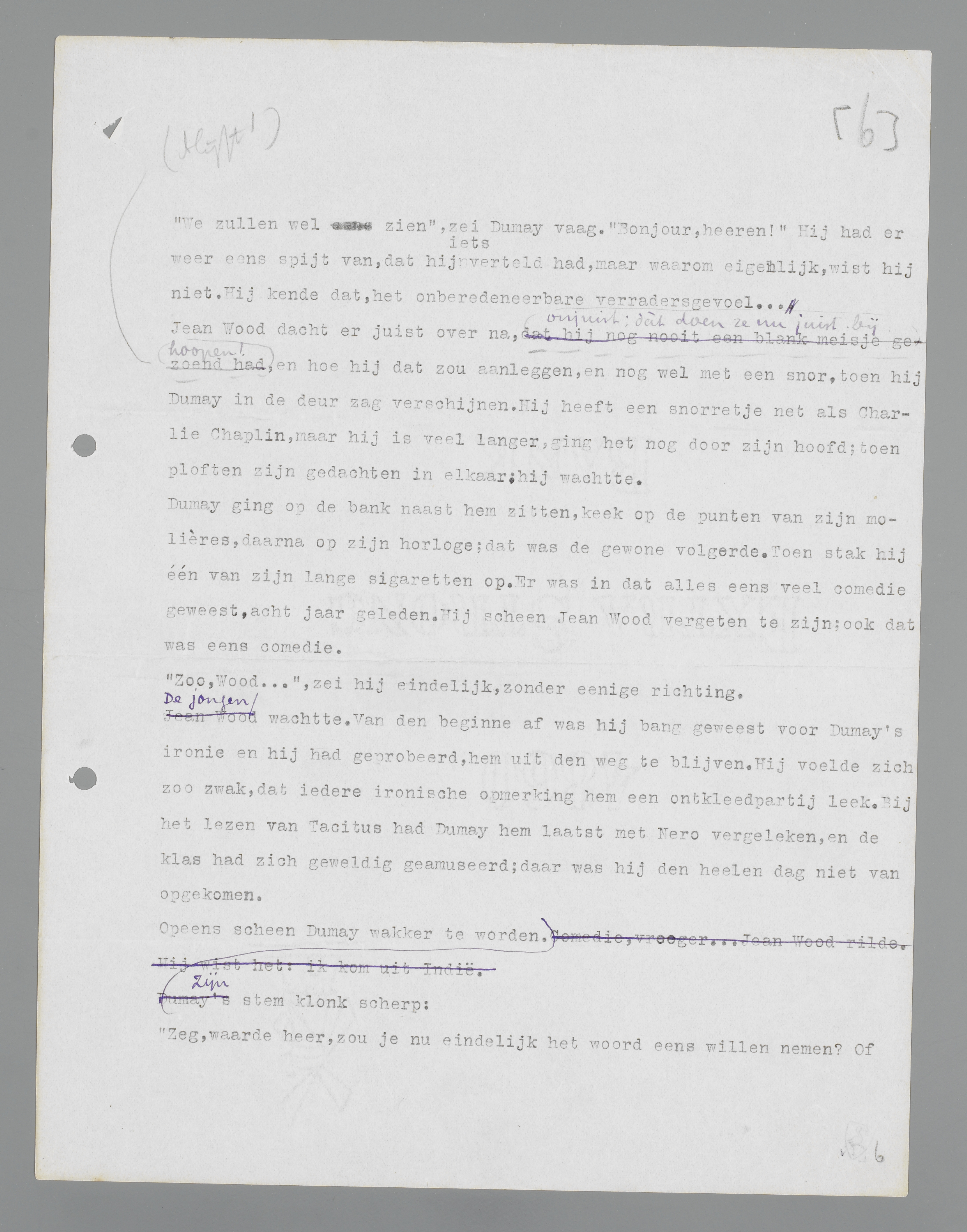 De jongen wachtte. Van den beginne af was hij bang geweest voor Dumay's ironie en hij had geprobeerd, hem uit de weg te blijven. Hij voelde zich zo zwak, dat iedere ironische opmerking hem een ontkleedpartij leek. Bij het lezen van Tacitus had Dumay hem laatst met Nero vergeleken, en de klas had zich geweldig geamuseerd; daar was hij de hele dag niet van opgekomen.