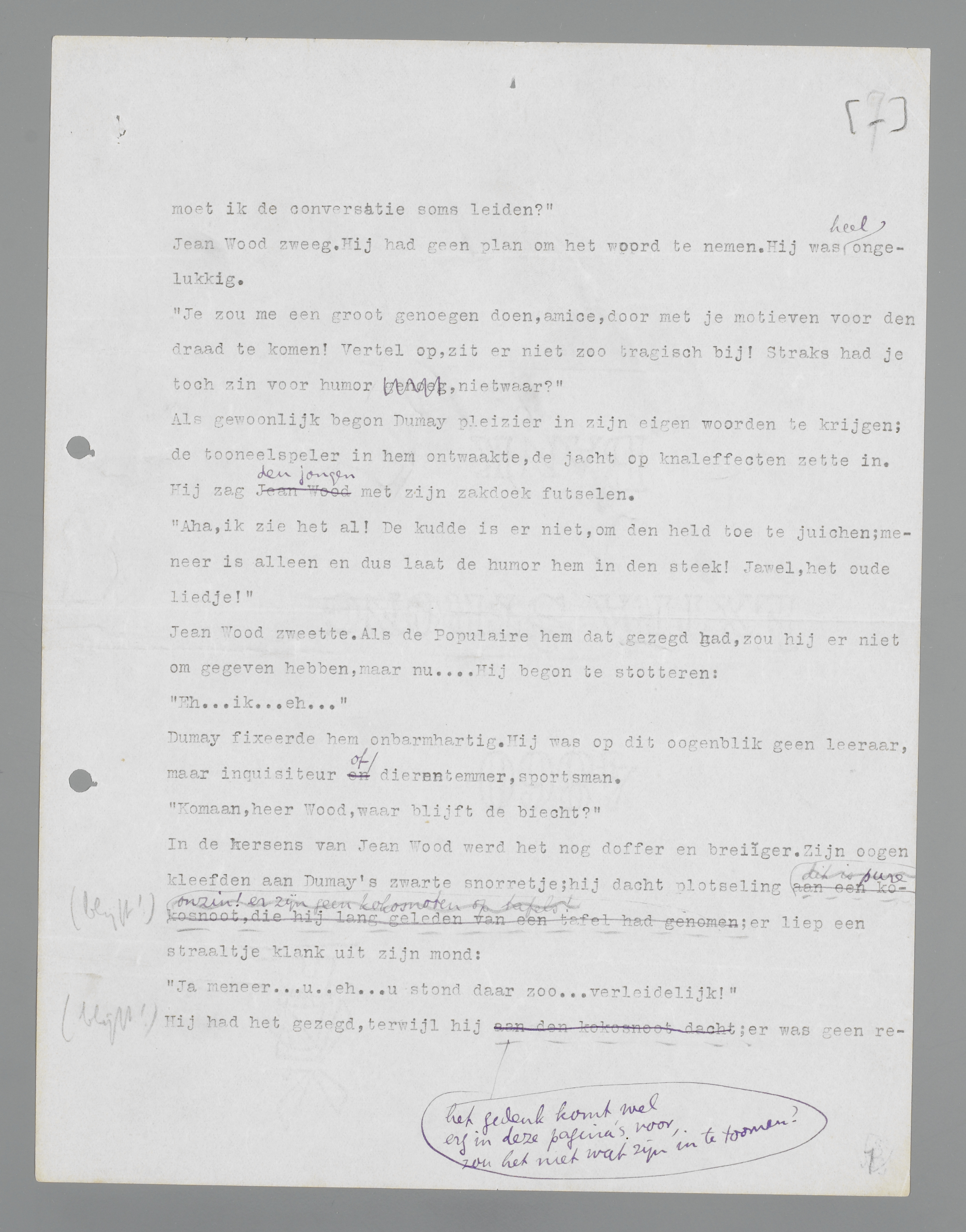 In de hersens van Jean Wood werd het nog doffer en brijiger. Zijn ogen kleefden aan Dumay's zwarte snorretje; hij dacht plotseling aan een kokosnoot, die hij lang geleden van een tafel had genomen; er liep een straaltje klank uit zijn mond: