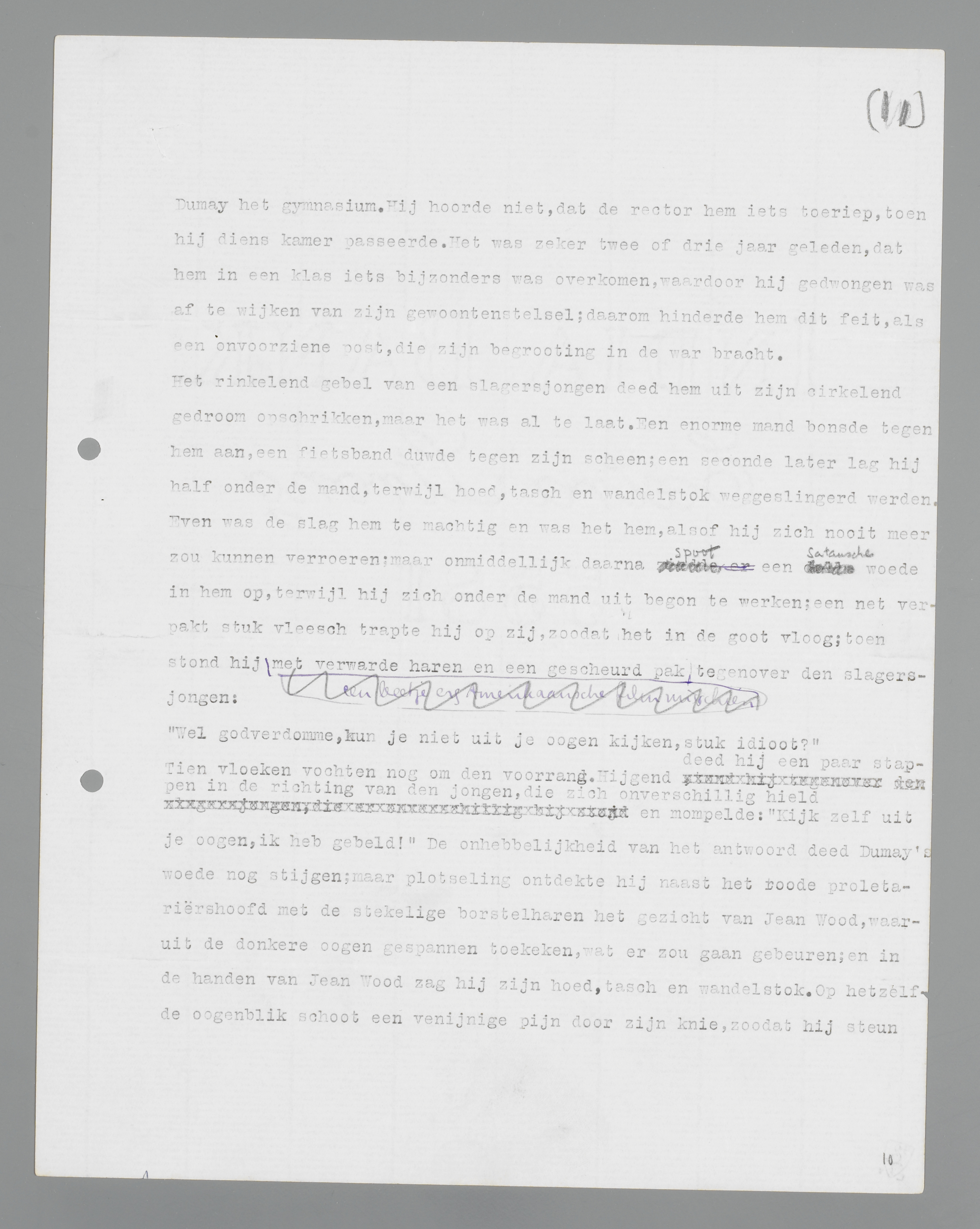 Tien vloeken vochten nog om de voorrang. Hijgend deed hij een paar stappen in de richting van de jongen, die zich onverschillig hield en mompelde: ‘Kijk zelf uit je ogen, ik heb gebeld!’ De onhebbelijkheid van het antwoord deed Dumay's woede nog stijgen; maar plotseling ontdekte hij naast het rode proletariërshoofd met de stekelige borstelharen het gezicht van Jean Wood, waaruit de donkere ogen gespannen toekeken, wat er zou gaan gebeuren; en in de handen van Jean Wood zag hij zijn hoed, tas en wandelstok. Op hetzelfde ogenblik schoot een venijnige pijn door zijn knie, zodat hij steun moest zoeken aan de schouder van de slagersknecht, tegenover wie hij zich als een kemphaan had opgesteld. Jean Wood kwam uit de kring der omstanders naar voren en gaf hem de verloren ingrediënten aan. Quasi-onverschillig voor de groeiende belangstelling en de aanwezigheid van zijn discipel ordende hij zijn toilet zo goed en zo kwaad als dat ging en zei onverstaanbaar iets verzoenends tegen de slagersjongen en ‘merci’ tegen Jean Wood; daarna ondernam hij hompelend met behulp van zijn wandelstok de tocht naar huis. De pijn in zijn knie stak hem, maar zijn woede lag begraven onder een drukkend gevoel van malaise.