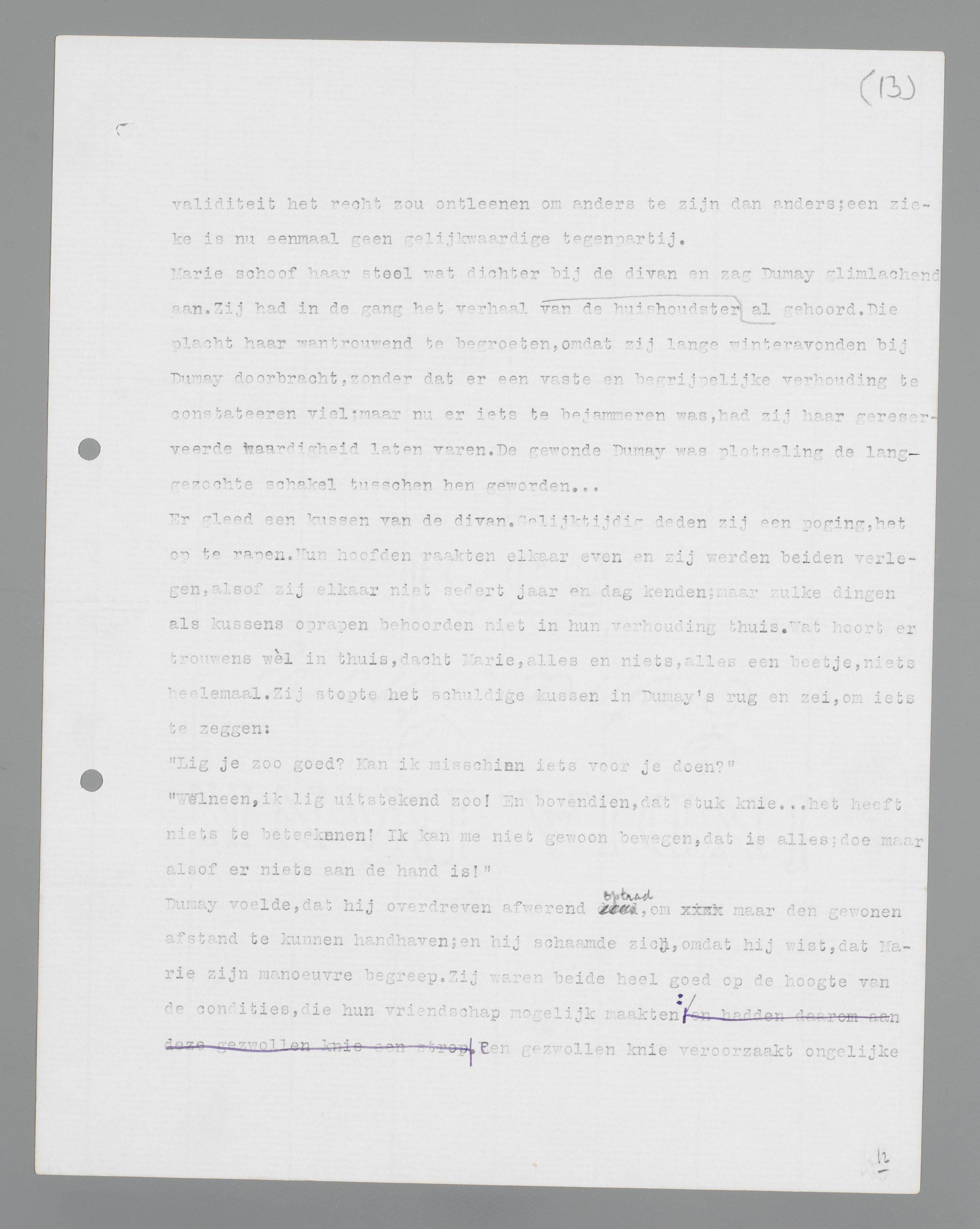 Dumay bromde een antwoord. Hij lag op de divan en mocht zijn knie niet bewegen. Zijn huishoudster had de dokter opgebeld, die iets had gezegd van ‘de knie, het gevoeligste deel van het lichaam’ en ‘rust houden’; ‘het was absoluut niet ernstig, maar het zou ernstig kunnen worden, als hij niet oppaste.’ Marie had hij niet meer kunnen afzeggen. Dat speet hem; hij had allerminst behoefte aan haar als ziekentroost en was bang, dat zij aan zijn invaliditeit het recht zou ontlenen om anders te zijn dan anders; een zieke is nu eenmaal geen gelijkwaardige tegenpartij.