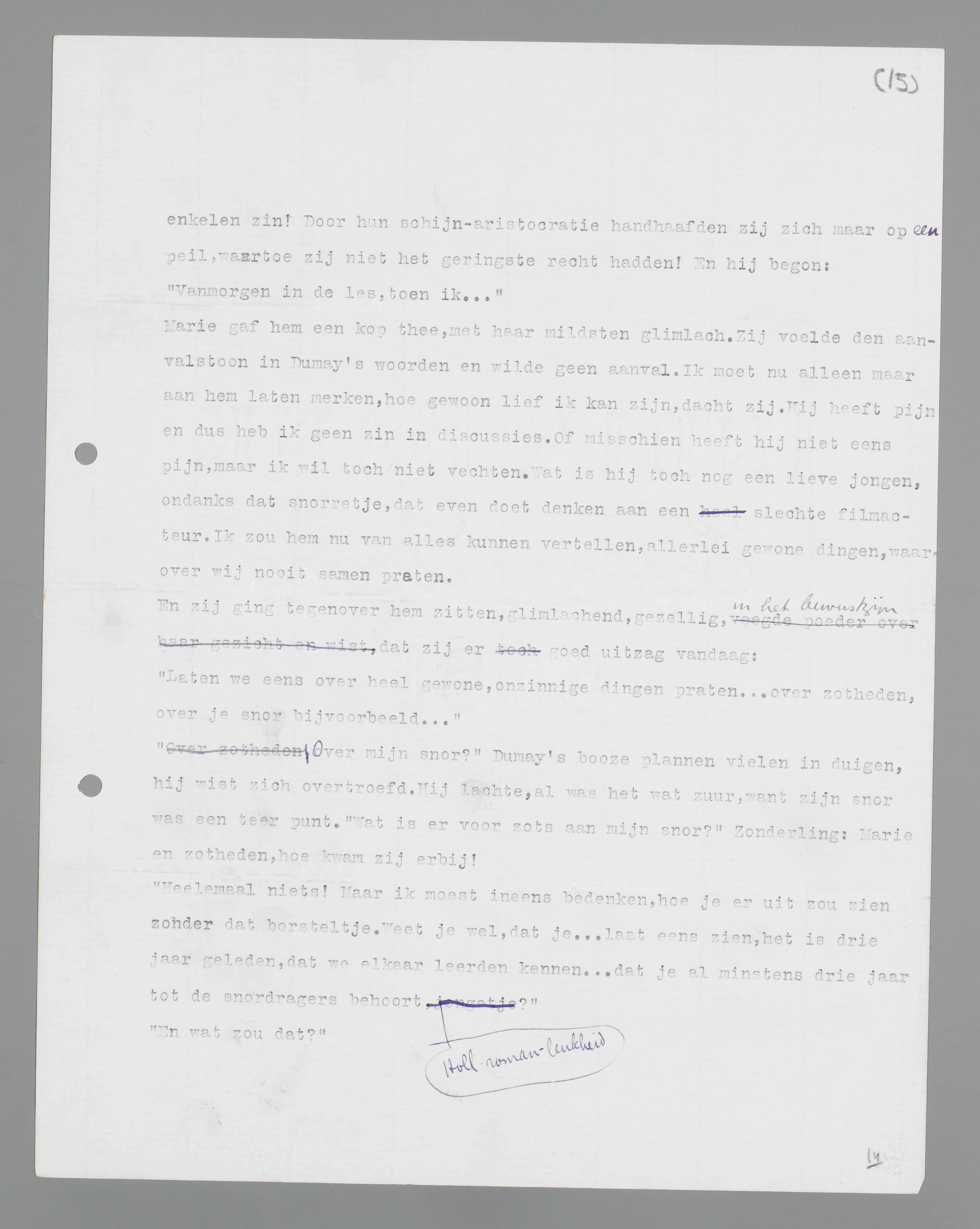 De neiging bekroop hem, zijn ergernis over het gebeurde op Marie te wreken, door haar deze gevallen in al hun zotheid en platvloersheid voor te leggen. Hij had nooit zotte of platte dingen uit haar mond gehoord en vermoedde boosaardig, dat zij een kleur zou krijgen, wanneer hij het woord ‘achterste’ als een baksteen in het gesprek liet neerplompen. Voor de duivel, waarom niet? Had hij tegen de slager ook niet gevloekt? die pudeur van beschaafde vrouwen had geen enkele zin! Door hun schijn-aristocratie handhaafden zij zich maar op een peil, waartoe zij niet het geringste recht hadden! En hij begon: