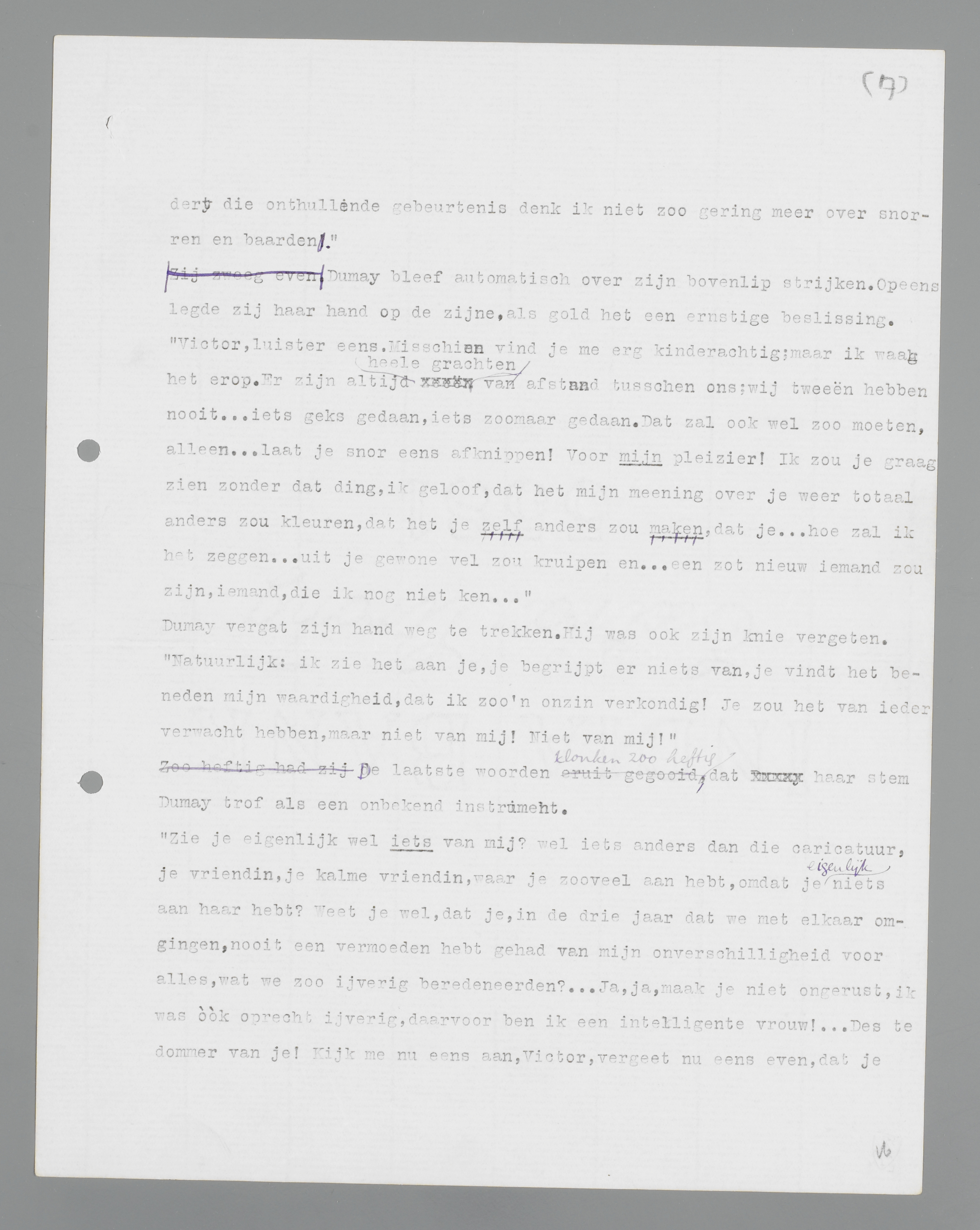 ‘Victor, luister eens. Misschien vind je me erg kinderachtig; maar ik waag het erop. Er zijn altijd hele grachten van afstand tussen ons; wij tweeën hebben nooit ... iets geks gedaan, iets zo maar gedaan. Dat zal ook wel zo moeten, alleen ... laat je snor eens afknippen! Voor mijn pleizier! Ik zou je graag zien zonder dat ding, ik geloof, dat het mijn mening over je weer totaal anders zou kleuren, dat het je zelf anders zou maken, dat je ... hoe zal ik het zeggen ... uit je gewone vel zou kruipen en ... een zot, nieuw iemand zou zijn, iemand, die ik nog niet ken. ...’