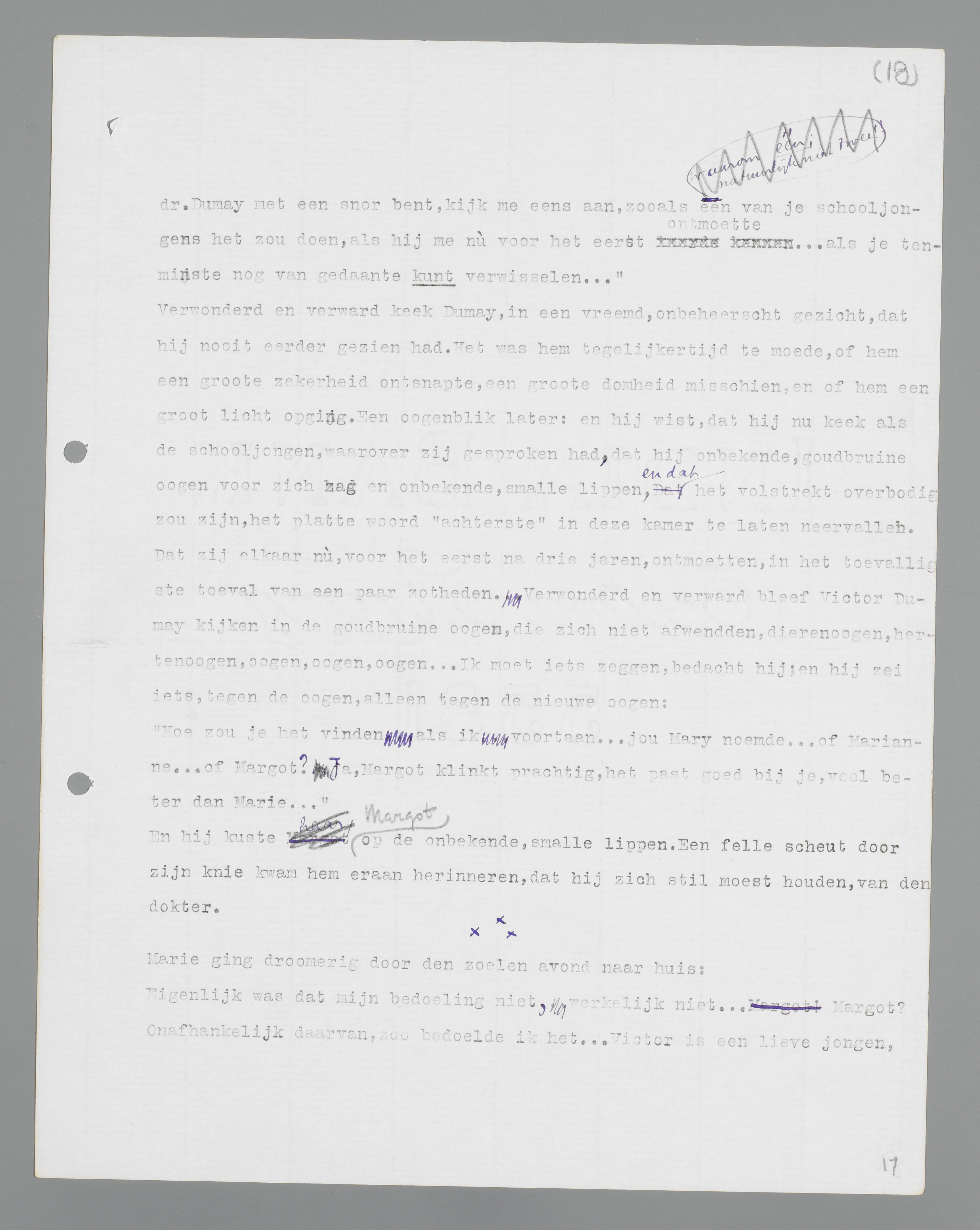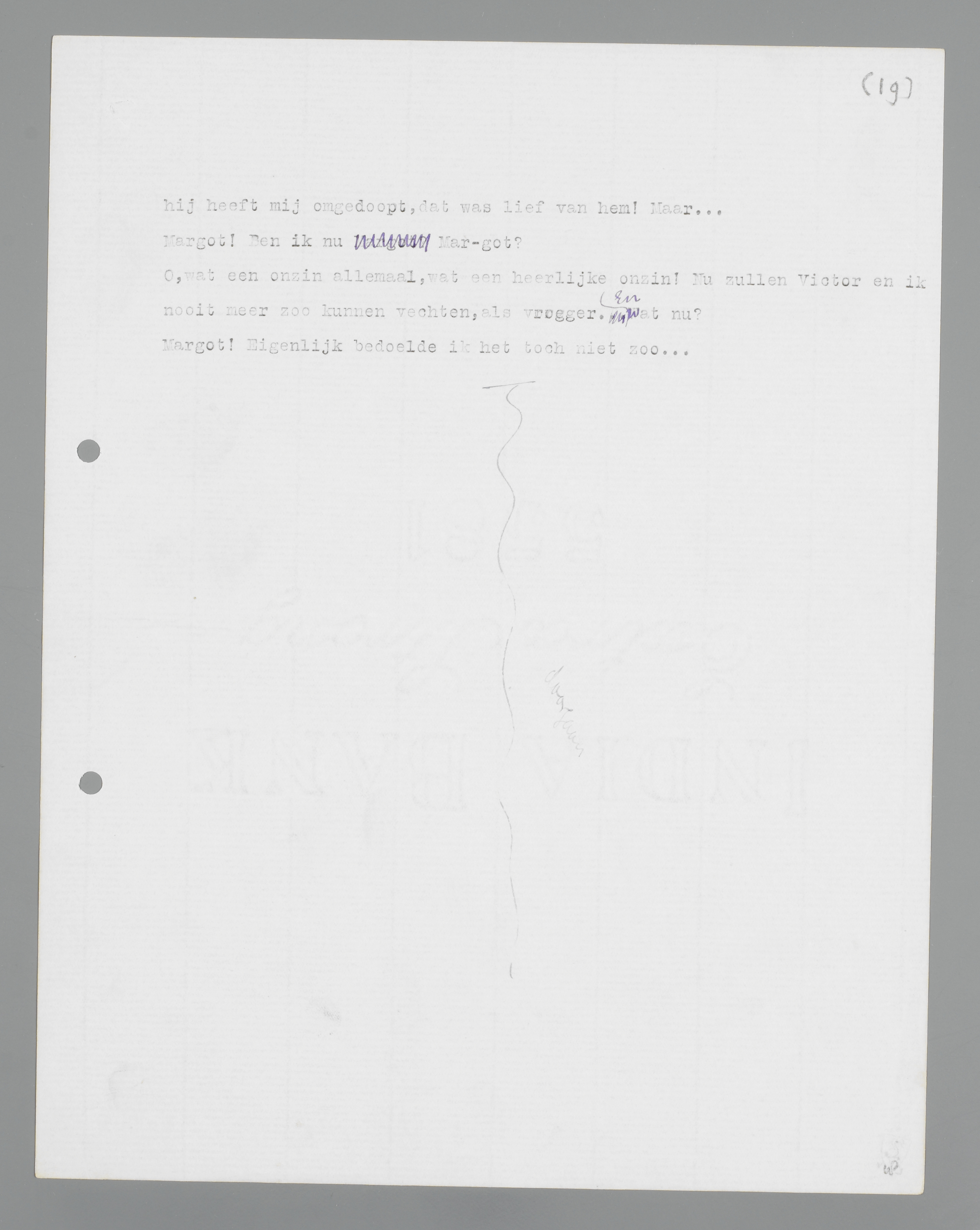 Eigenlijk was dat mijn bedoeling niet, werkelijk niet. ... Margot? Onafhankelijk daarvan, zo bedoelde ik het. ... Victor is een lieve jongen, hij heeft mij omgedoopt, dat was lief van hem! Maar ...