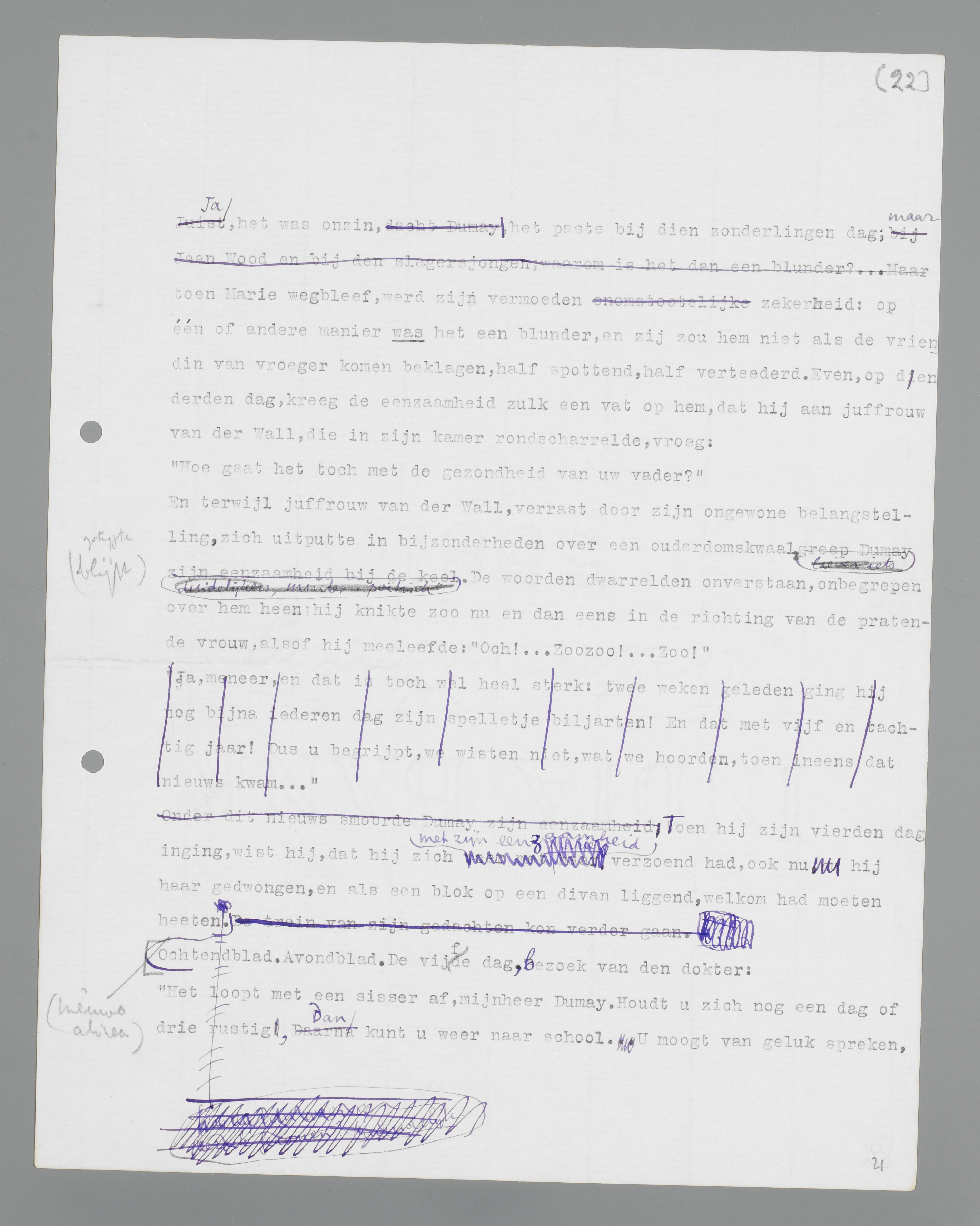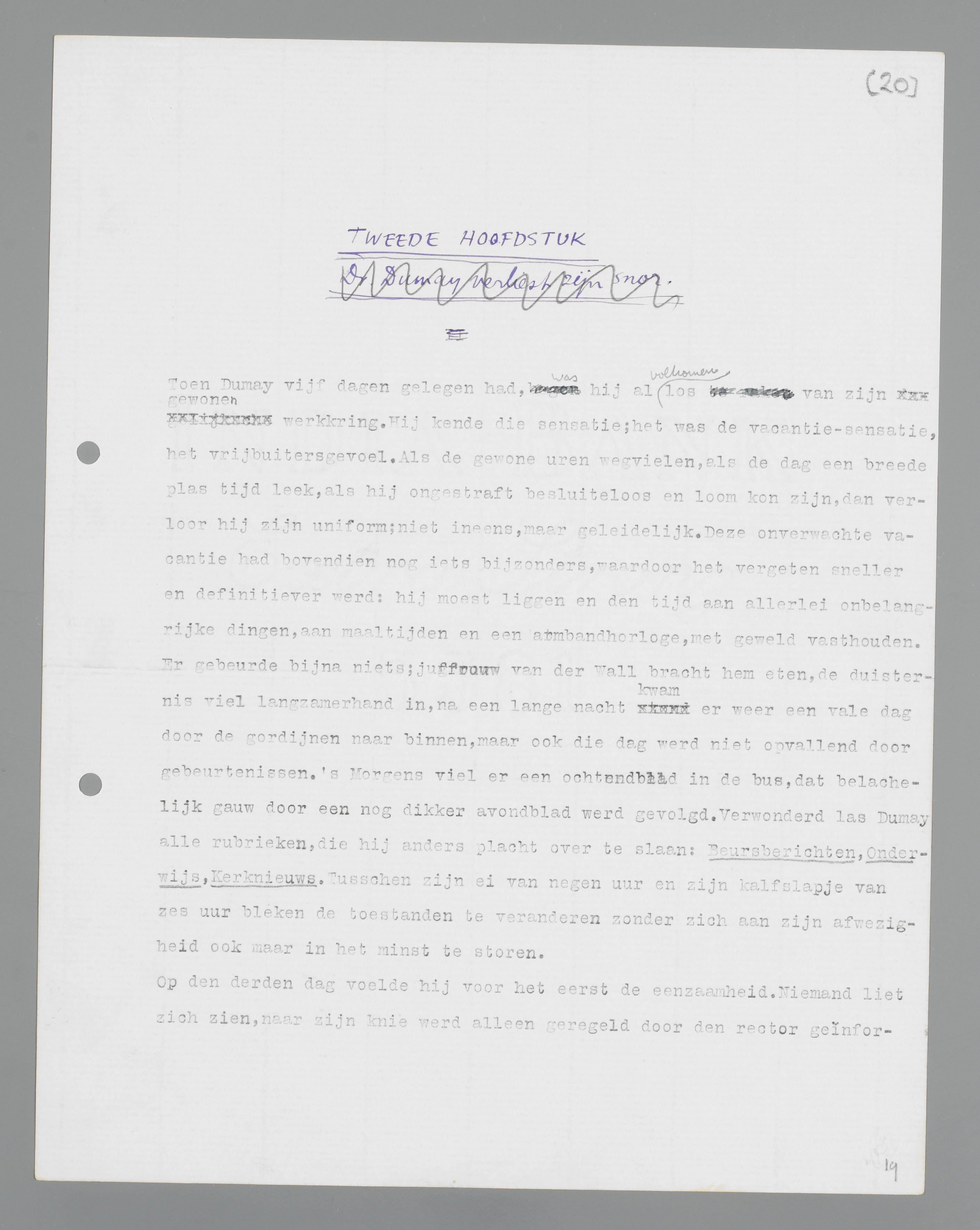 Er gebeurde bijna niets; juffrouw Van der Wall bracht hem eten, de duisternis viel langzamerhand in, na een lange nacht kwam er weer een vale dag door de gordijnen naar binnen, maar ook die dag werd niet opvallend door gebeurtenissen. 's Morgens viel er een ochtendblad in de bus, dat belachelijk gauw door een nog dikker avondblad werd gevolgd. Verwonderd las Dumay alle rubrieken, die hij anders placht over te slaan: Beursberichten, Onderwijs, Kerknieuws. Tussen zijn ei van negen uur en zijn kalfslapje van zes uur bleken de toestanden te veranderen zonder zich aan zijn afwezigheid ook maar in het minst te storen.