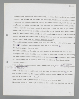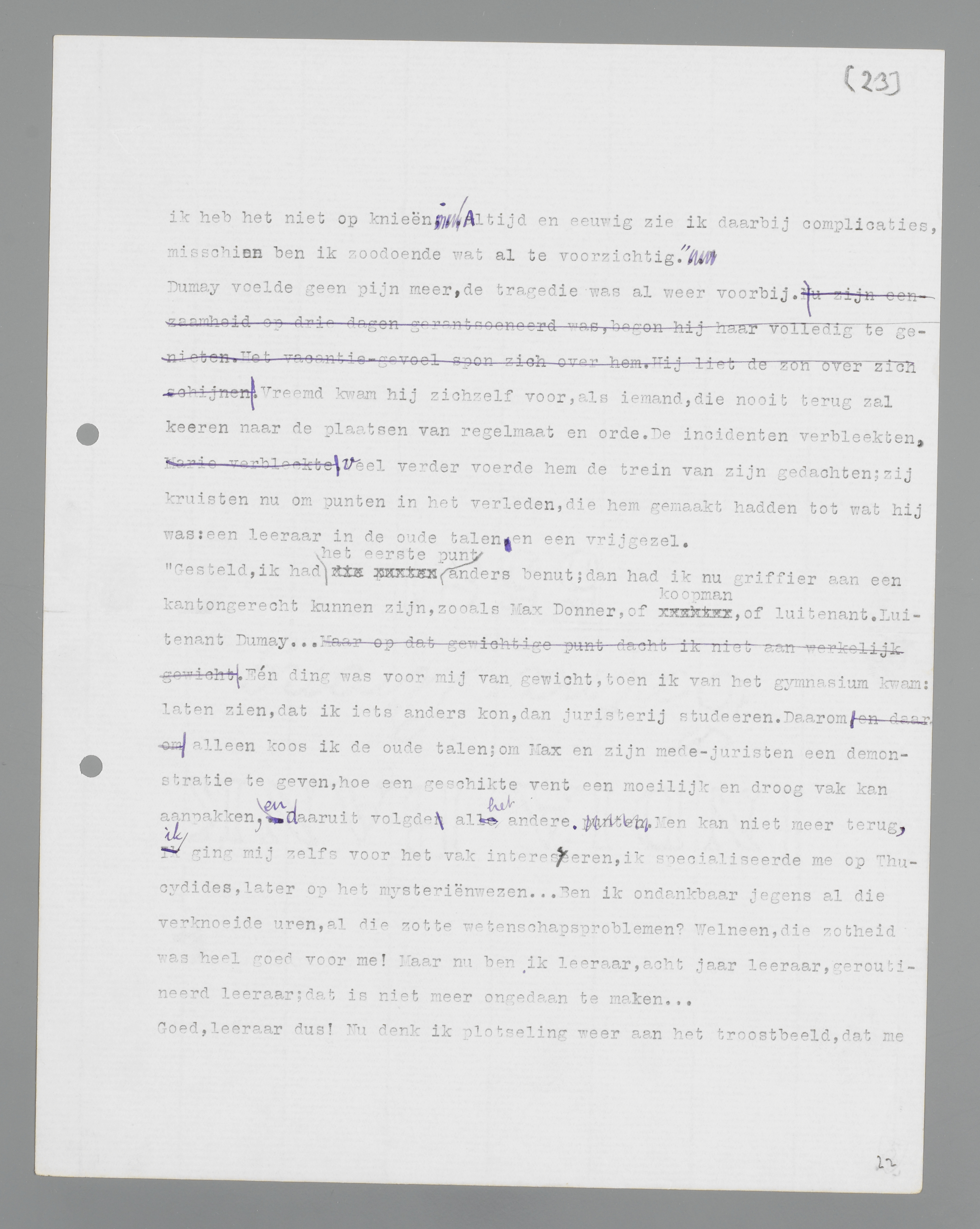 ‘Gesteld, ik had het eerste punt anders benut; dan had ik nu griffier aan een kantongerecht kunnen zijn, zoals Max Donner, of koopman, of luitenant. Luitenant Dumay. ... Eén ding was voor mij van gewicht, toen ik van het gymnasium kwam: laten zien, dat ik iets anders kon, dan juristerij studeren. Daarom alleen koos ik de oude talen; om Max en zijn medejuristen een demonstratie te geven, hoe een geschikte vent een moeilijk en droog vak kan aanpakken, en daaruit volgde al het andere. Men kan niet meer terug, ik ging mij zelfs voor het vak interesseren, ik specialiseerde me op Thucydides, later op het mysteriënwezen. ... Ben ik ondankbaar jegens al die verknoeide uren, al die zotte wetenschapsproblemen? Welneen, die zotheid was heel goed voor me! Maar nu ben ik leraar, acht jaar leraar, geroutineerd leraar; dat is niet meer ongedaan te maken.