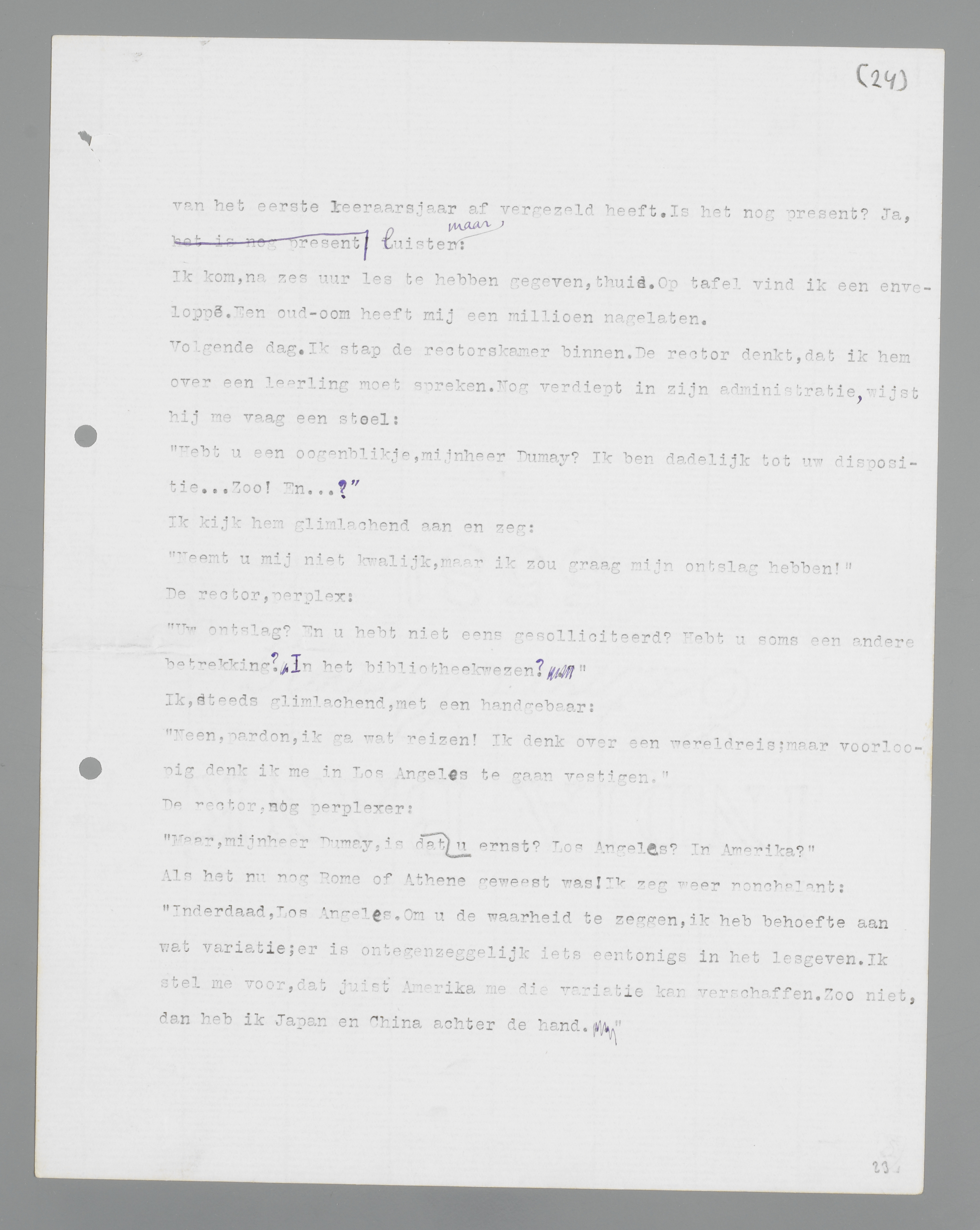 Volgende dag. Ik stap de rectorskamer binnen. De rector denkt, dat ik hem over een leerling moet spreken. Nog verdiept in zijn administratie, wijst hij me vaag een stoel: