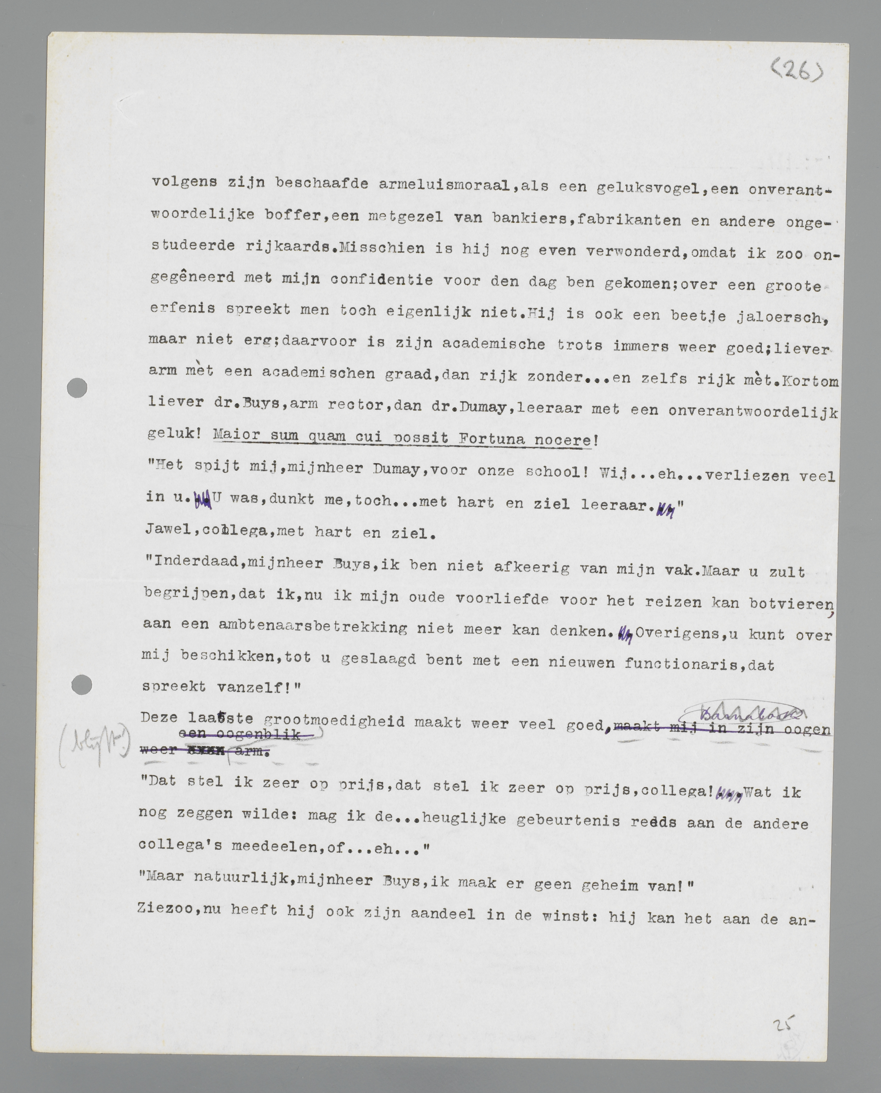 Nu zie ik het aan zijn opgelucht gezicht en aan het heftige gebaar, waarmee hij mij gelukwenst: nu, in een ogenblik, heeft hij mij geclasseerd volgens zijn beschaafde armeluismoraal, als een geluksvogel, een onverantwoordelijke boffer, een metgezel van bankiers, fabrikanten en andere ongestudeerde rijkaards. Misschien is hij nog even verwonderd, omdat ik zo ongegêneerd met mijn confidentie voor den dag ben gekomen; over een grote erfenis spreekt men toch eigenlijk niet. Hij is ook een beetje jaloers, maar niet erg; daarvoor is zijn academische trots immers weer goed; liever arm mèt een academische graad, dan rijk zonder ... en zelfs rijk mèt. Kortom liever dr Buys, arm rector, dan dr Dumay, leraar met een onverantwoordelijk geluk! Maior sum quam cui possit Fortuna nocere!