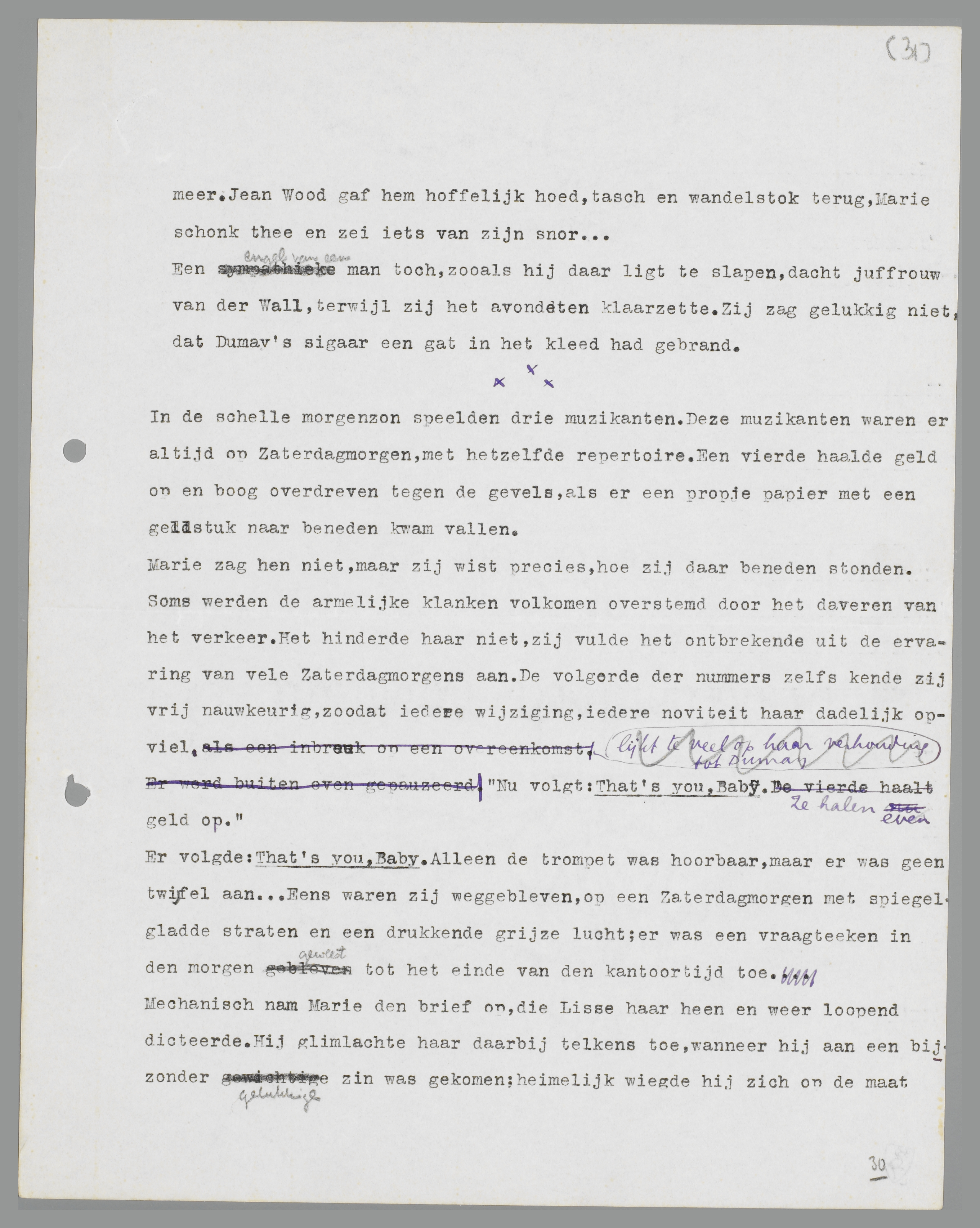 Ervolgde: That's you, Baby. Alleen de trompet was hoorbaar, maar er was geen twijfel aan. ... Eens waren zij weggebleven, op een Zaterdagmorgen met spiegelgladde straten en een drukkende grijze lucht; er was een vraagteken in de morgen geweest tot het einde van de kantoortijd toe.