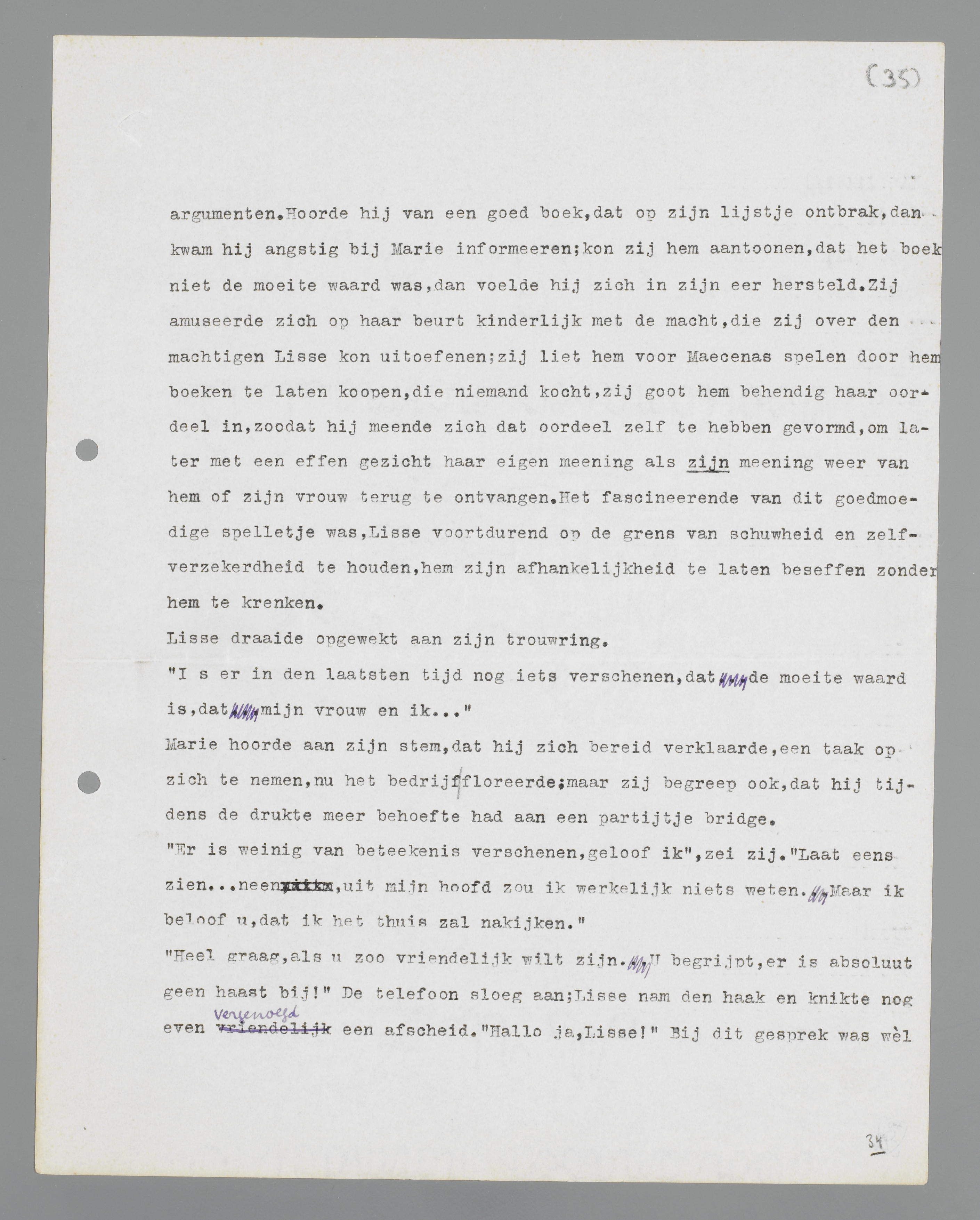 genoegen; de stem van zijn geweten dreef hem echter steeds weer naar de rijstebrijberg; het verlangen om autoriteit te zijn ook op dit gebied, liet hem niet met rust. Door een toevallig gesprek had hij ontdekt, dat Marie in de geheimen van deze warenkennis was ingewijd; daaruit had zich het boekenlijstje ontwikkeld, waarop Marie geregeld de pas verschenen goede boeken noteerde. Aanvankelijk had zij zich bezwaard gevoeld door dit monopolie over Lisse's litteraire smaak; zij gaf ook, om hem een pleizier te doen, nieuwe detective-romans en thrillers op. Het was haar echter gebleken, dat Lisse van die weldadigheid niet gediend was; de slechte boeken ontdekte hij zelf aan de nieuwsgierigheid en de spanning, die zij in hem teweeg brachten. Langzamerhand was hij in zijn keuze van goede boeken geheel van Marie afhankelijk geworden; hij kocht, wat op zijn boekenlijstje voorkwam en verdedigde tegenover zijn kennissen Marie's keuze met Marie's argumenten. Hoorde hij van een goed boek, dat op zijn lijstje ontbrak, dan kwam hij angstig bij Marie informeren; kon zij hem aantonen, dat het boek niet de moeite waard was, dan voelde hij zich in zijn eer hersteld. Zij amuseerde zich op haar beart kinderlijk met de macht, die zij over de machtige Lisse kon uitoefenen; zij liet hem voor Maecenas spelen door hem boeken te laten kopen, die niemand kocht, zij goot hem behendig haar oordeel in, zodat hij meende zich dat oordeel zelf te hebben gevormd, om later met een effen gezicht haar eigen mening als zijn mening weer van hem of zijn vrouw terug te ontvangen. Het fascinerende van dit goedmoedige spelletje was, Lisse voortdurend op de grens van schuwheid en zelfverzekerdheid te houden, hem zijn afhankelijkheid te laten beseffen zonder hem te krenken.