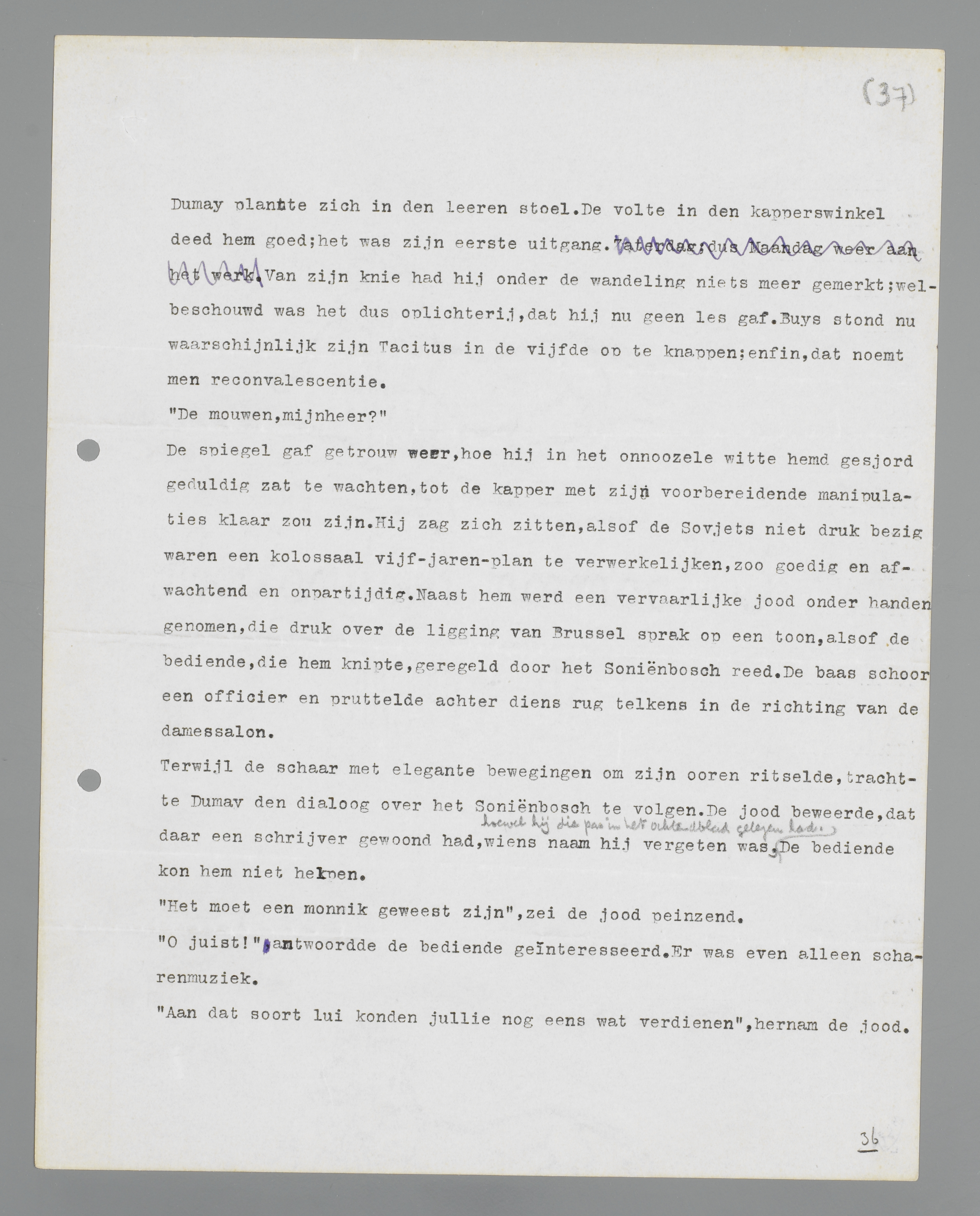 Terwijl de schaar met elegante bewegingen om zijn oren ritselde, trachtte Dumay de dialoog over het Soniënbos te volgen. De jood beweerde, dat daar een schrijver gewoond had, wiens naam hij vergeten was, hoewel hij die pas in het ochtendblad gelezen had. De bediende kon hem niet helpen.