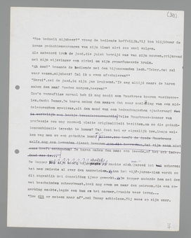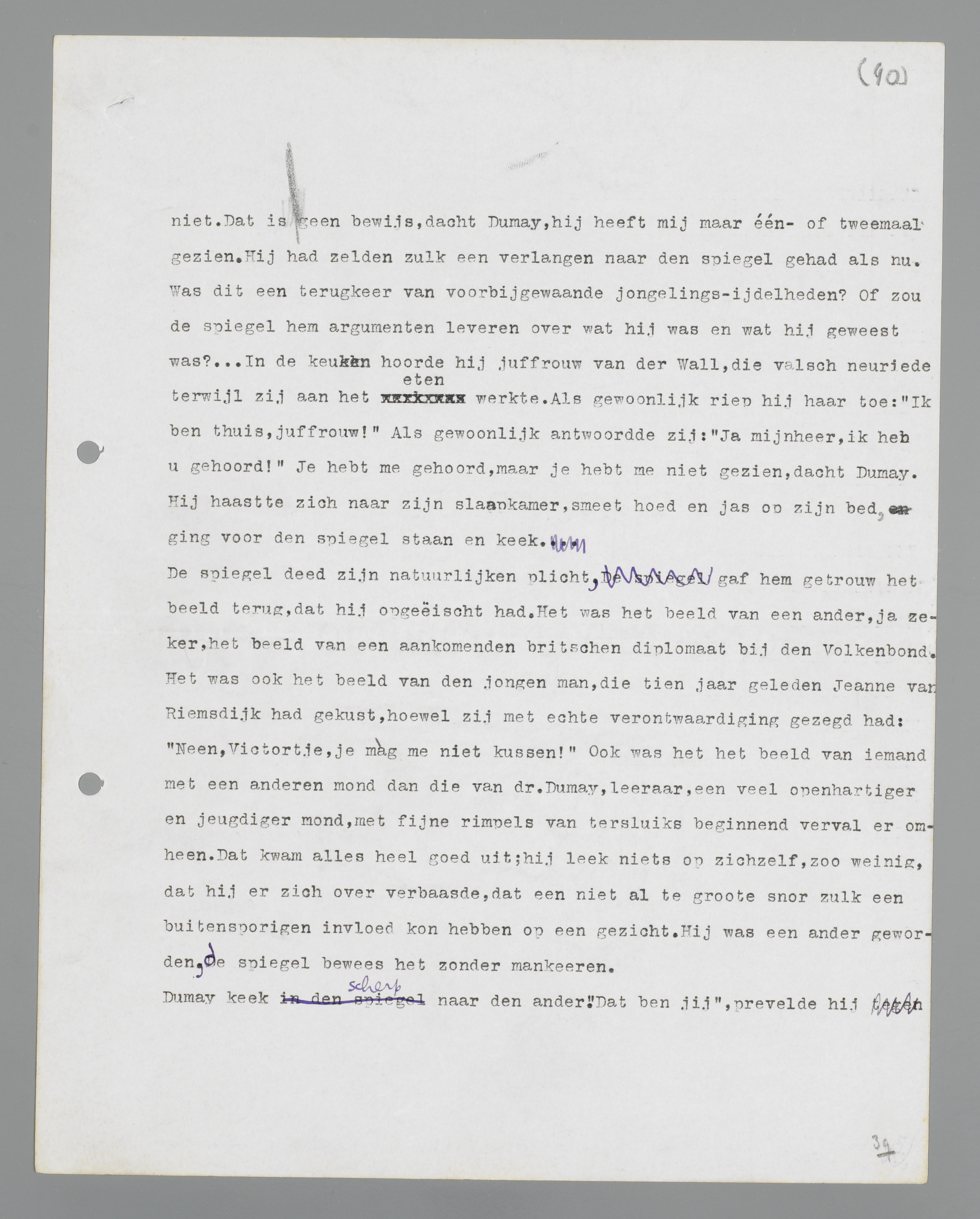 Bij zijn huisdeur kwam hij de loopjongen van zijn boekhandelaar tegen, die gebeld had om een pakje voor hem af te geven. De jongen herkende hem niet. Dat is geen bewijs, dacht Dumay, hij heeft mij maar één- of tweemaal gezien. Hij had zelden zulk een verlangen naar de spiegel gehad als nu. Was dit een terugkeer van voorbijgewaande jongelings-ijdelheden? Of zou de spiegel hem argumenten leveren over wat hij was en wat hij geweest was? ... In de keuken hoorde hij juffrouw Van der Wall, die vals neuriede terwijl zij aan het eten werkte. Als gewoonlijk riep hij haar toe: ‘Ik ben thuis, jufirouw!’ Als gewoonlijk antwoordde zij: ‘Ja mijnheer, ik heb u gehoord!’ Je hebt me gehoord, maar je hebt me niet gezien, dacht Dumay. Hij haastte zich naar zijn slaapkamer, smeet hoed en jas op zijn bed, ging voor de spiegel staan en keek.