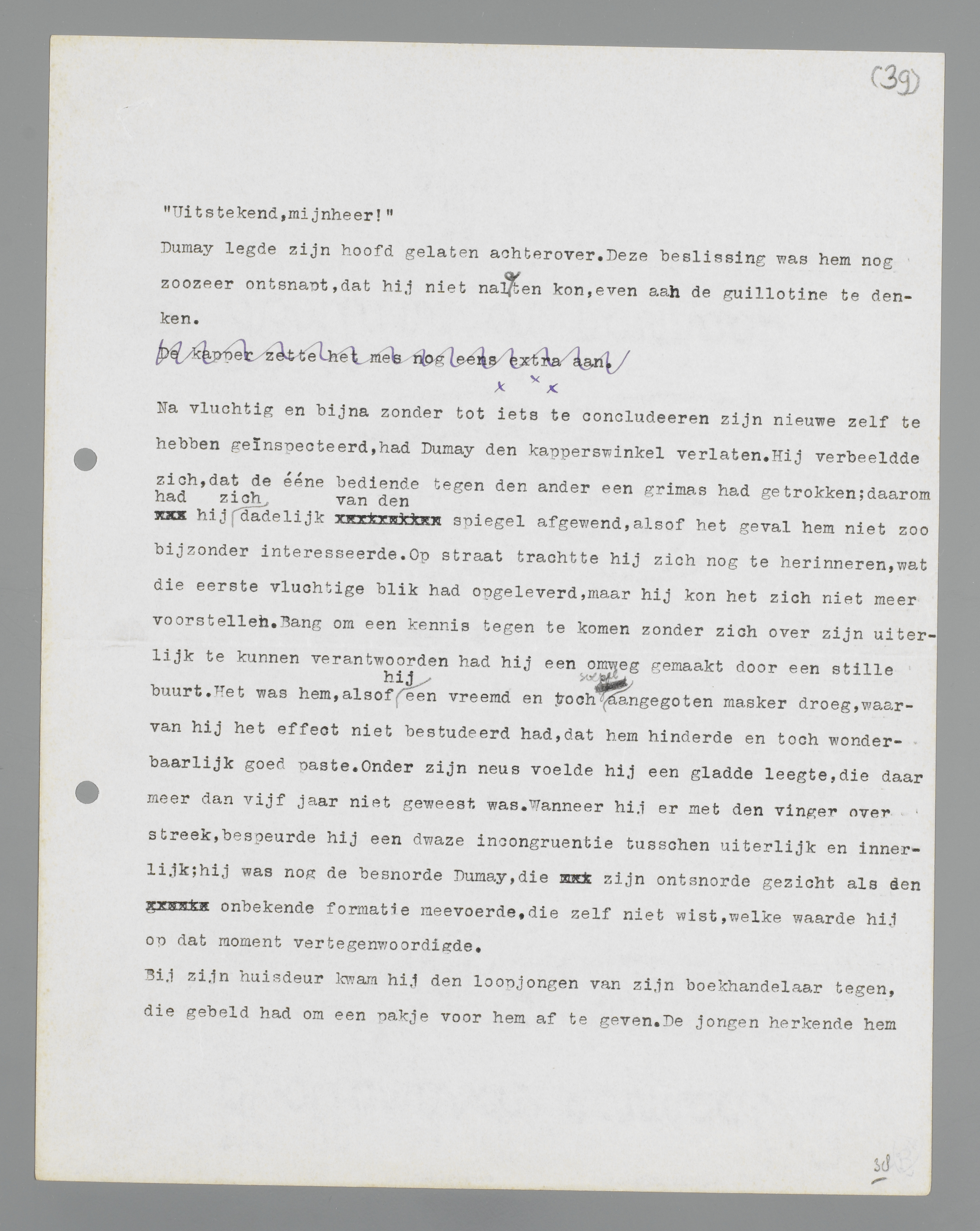 Na vluchtig en bijna zonder tot iets te concluderen zijn nieuwe zelf te hebben geïnspecteerd, had Dumay de kapperswinkel verlaten. Hij verbeeldde zich, dat de éne bediende tegen de ander een grimas had getrokken; daarom had hij zich dadelijk van de spiegel afgewend, alsof het geval hem niet zo bijzonder interesseerde. Op straat trachtte hij zich nog te herinneren, wat die eerste vluchtige blik had opgeleverd, maar hij kon het zich niet meer voorstellen. Bang om een kennis tegen te komen zonder zich over zijn uiterlijk te kunnen verantwoorden had hij een omweg gemaakt door een stille buurt. Het was hem, alsof hij een vreemd en toch soepel aangegoten masker droeg, waarvan hij het effect niet bestudeerd had, dat hem hinderde en toch wonderbaarlijk goed paste. Onder zijn neus voelde hij een gladde leegte, die daar meer dan vijf jaar niet geweest was. Wanneer hij er met de vinger over streek, bespeurde hij een dwaze incongruentie tussen uiterlijk en innerlijk; hij was nog de besnorde Dumay, die zijn ontsnorde gezicht als de onbekende formatie meevoerde, die zelf niet wist, welke waarde hij op dat moment vertegenwoordigde.