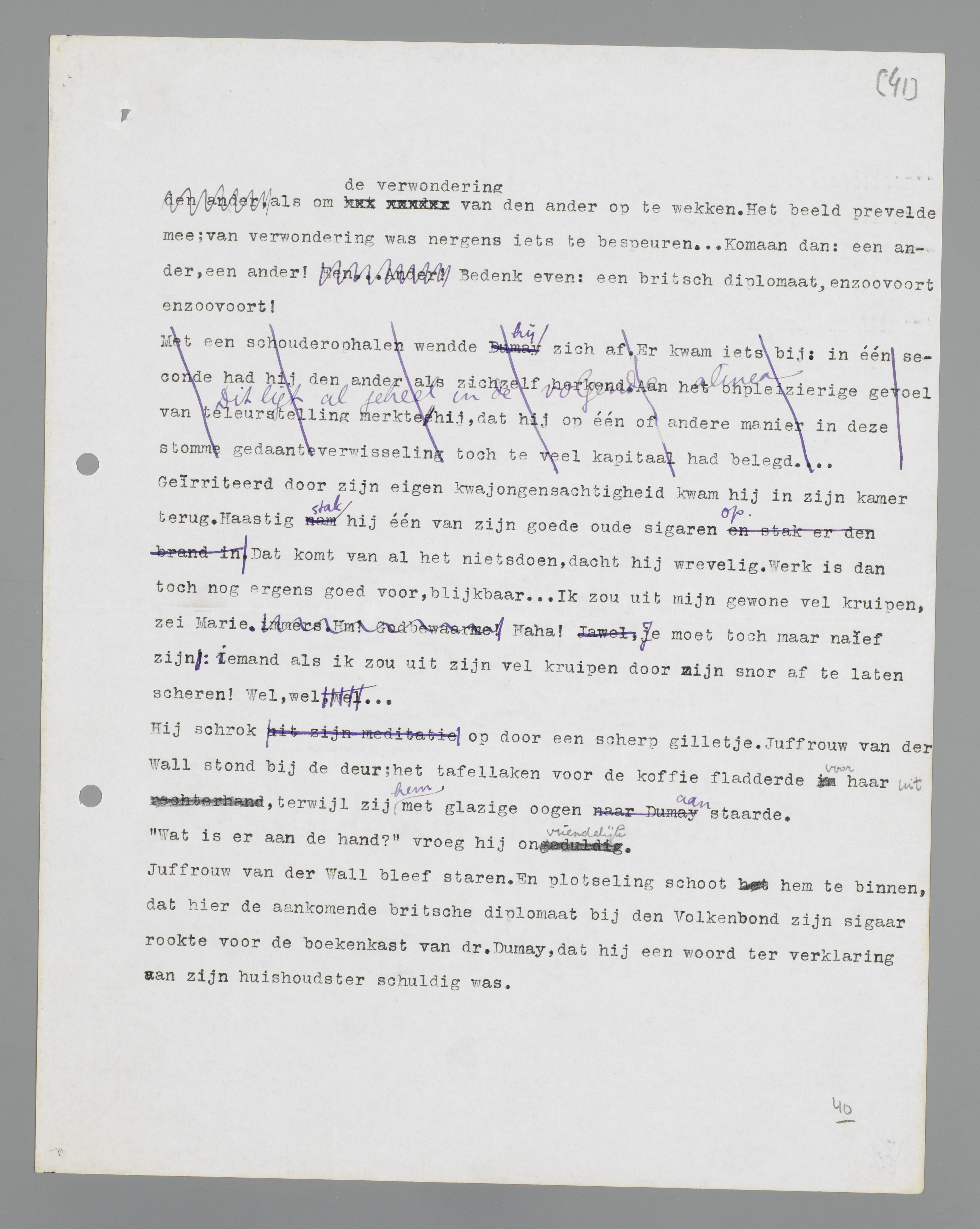 Dumay keek scherp naar de ander. ‘Dat ben jij,’ prevelde hij als om de verwondering van de ander op te wekken. Het beeld prevelde mee; van verwondering was nergens iets te bespeuren. ... Komaan dan: een ander, een ander! Bedenk even: een brits diplomaat, enzovoort enzovoort!