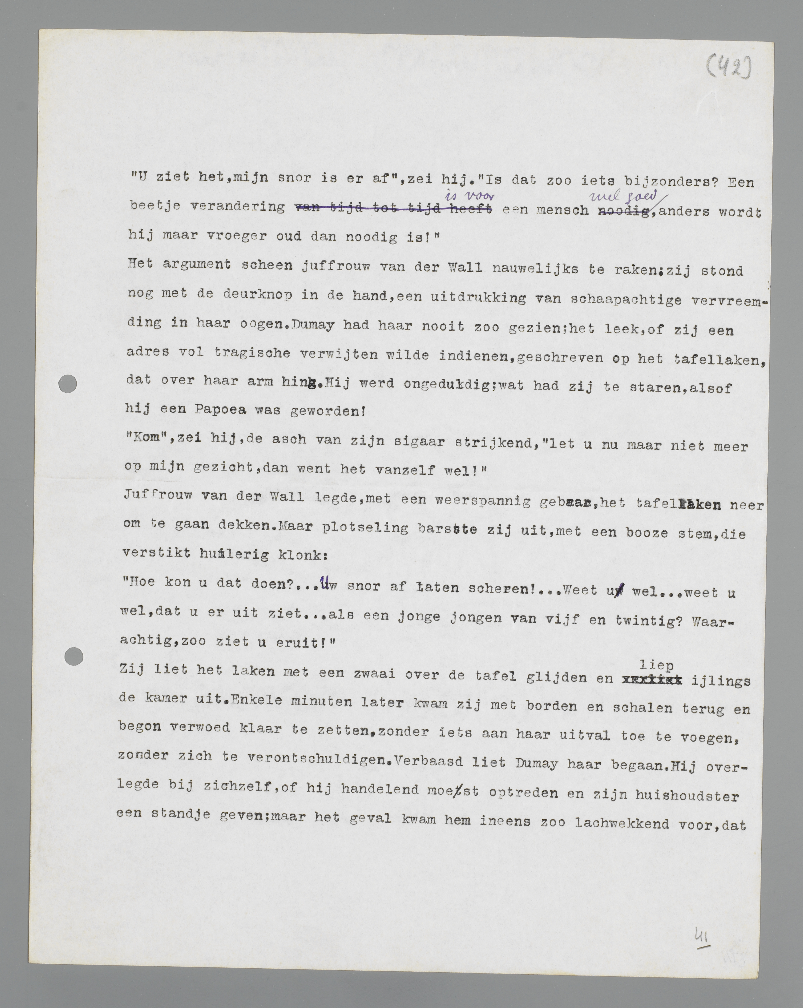 Het argument scheen juffrouw Van der Wall nauwelijks te raken; zij stond nog met de deurknop in de hand, een uitdrukking van schaapachtige vervreemding in haar ogen. Dumay had haar nooit zo gezien; het leek, of zij een adres vol tragische verwijten wilde indienen, geschreven op het tafellaken, dat over haar arm hing. Hij werd ongeduldig; wat had zij te staren, alsof hij een Papoea was geworden!