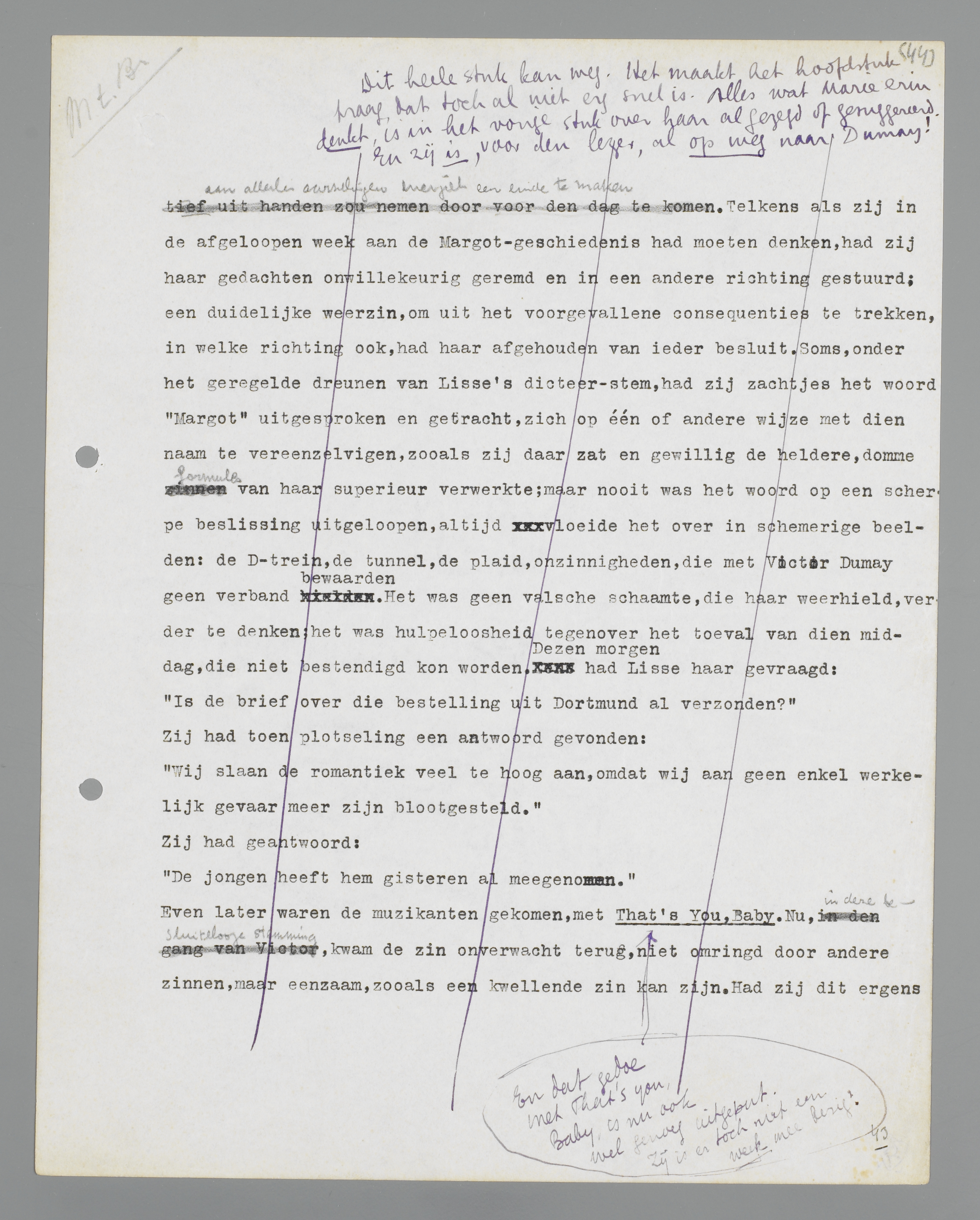 ‘Meenemen: That's you ... Margot! Meegenomen worden, plotseling weggenomen worden van het bureau, in een Dtrein zitten; iemand staat naast mij en zegt, dat ik de plaid vaster om mij heen moet trekken, want dat het kil is, nu wij in de tunnel zijn. De rook dwarrelt neer langs de ruiten en ik doe, of ik hem niet hoor, al zijn mijn voeten koud. Dan voel ik (maar ik blijf turen naar de ruiten, die groezelig beslaan) hoe hij de plaid steviger om mijn ijskoude voeten legt. ...