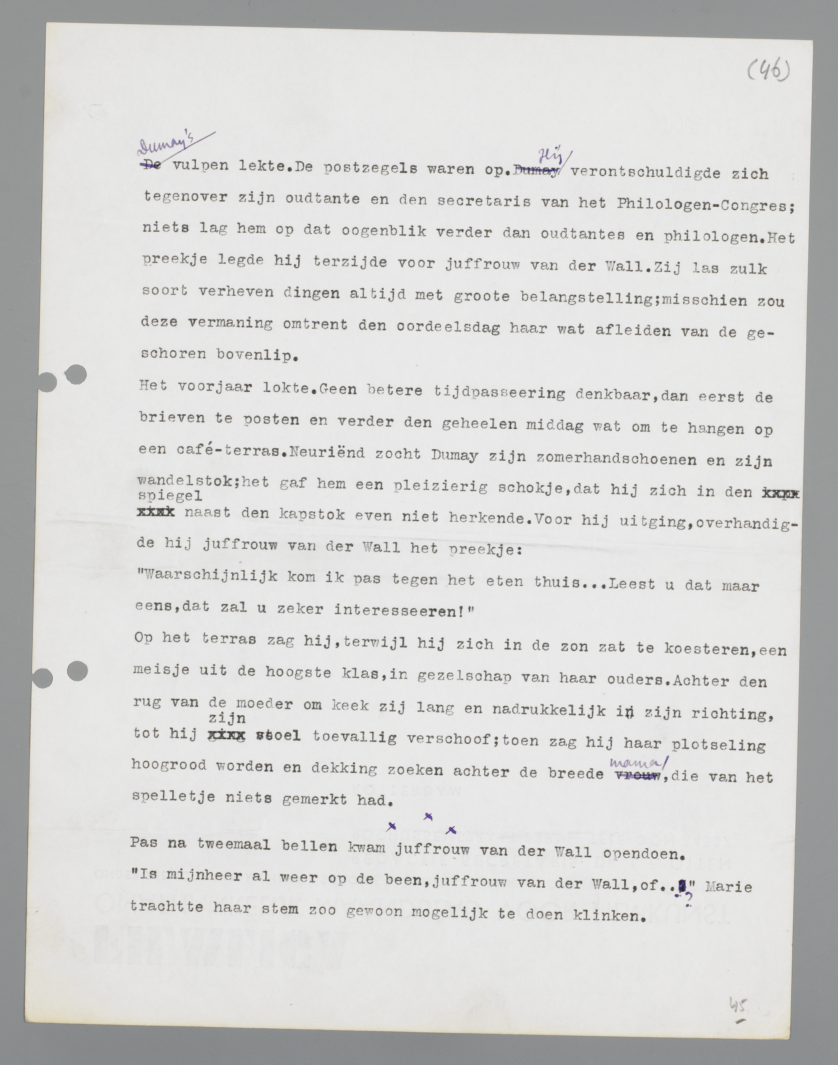 Dumay's vulpen lekte. De postzegels waren op. Hij verontschuldigde zich tegenover zijn oudtante en de secretaris van het Philologen-Congres; niets lag hem op dat ogenblik verder dan oudtantes en philologen. Het preekje legde hij terzijde voor juffrouw Van der Wall. Zij las zulk soort verheven dingen altijd met grote belangstelling; misschien zou deze vermaning