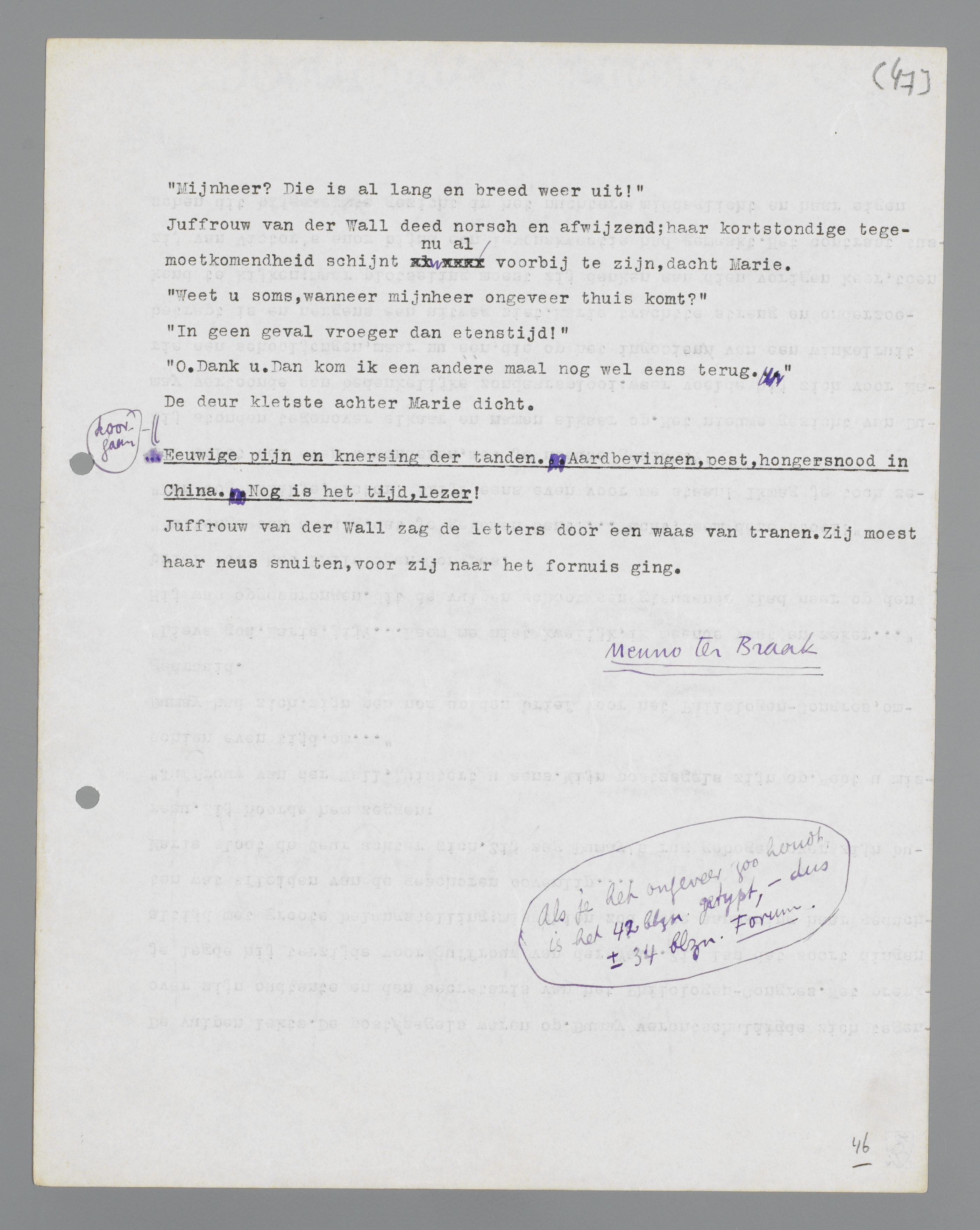 Een nieuwe bliksemflits; de claxon van een bepaalde auto wil niet tot zwijgen komen; een nieuwe poederregen stort van het stompje sigaar omlaag. ... Dumay lag stil, in een mierenhoop van kleine en grote geluiden, bewegingen, storingen. Hij luisterde nu alleen naar het zachte gewriemel van die mierenhoop. Het begin en het einde van zijn gewone redeneringen had hem in de steek gelaten; de dingen, die hij met bespottelijke energie had opgebouwd, lagen verstrooid om hem heen, tussen de geluiden en bewegingen, onnozele toevalsgaven.