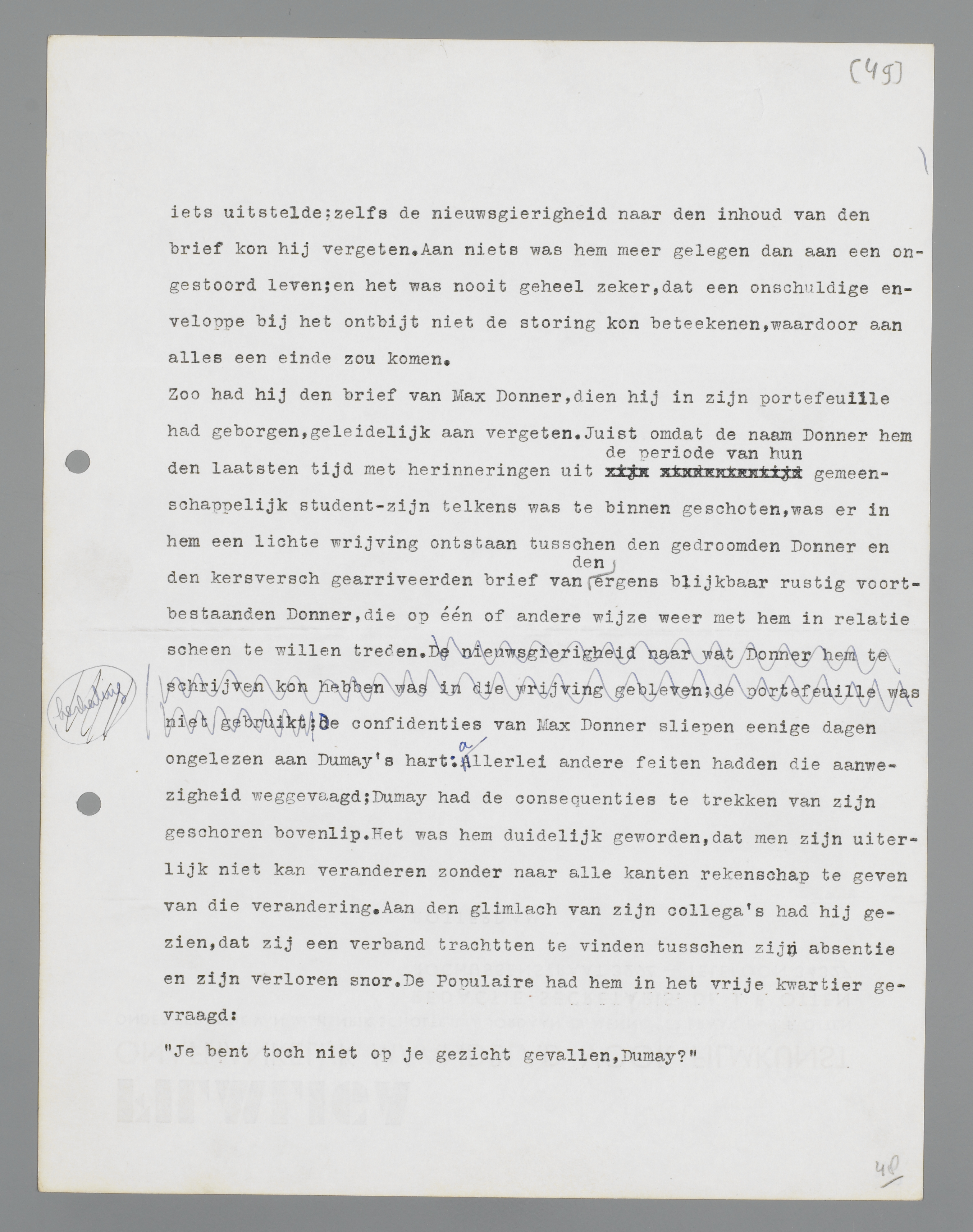 naam Donner hem de laatste tijd met herinneringen uit de periode van hun gemeenschappelijk studentzijn telkens was te binnen geschoten, was er in hem een lichte wrijving ontstaan tussen de gedroomde Donner en de kersvers gearriveerde brief van de ergens blijkbaar rustig voortbestaande Donner, die op één of andere wijze weer met hem in relatie scheen te willen treden. De confidenties van Max Donner sliepen enige dagen ongelezen aan Dumay's hart: allerlei andere feiten hadden die aanwezigheid weggevaagd; Dumay had de consequenties te trekken van zijn geschoren bovenlip. Het was hem duidelijk geworden, dat men zijn uiterlijk niet kan veranderen zonder naar alle kanten rekenschap te geven van die verandering. Aan de glimlach van zijn collega's had hij gezien, dat zij een verband trachtten te vinden tussen zijn absentie en zijn verloren snor. De Populaire had hem in het vrije kwartier gevraagd: