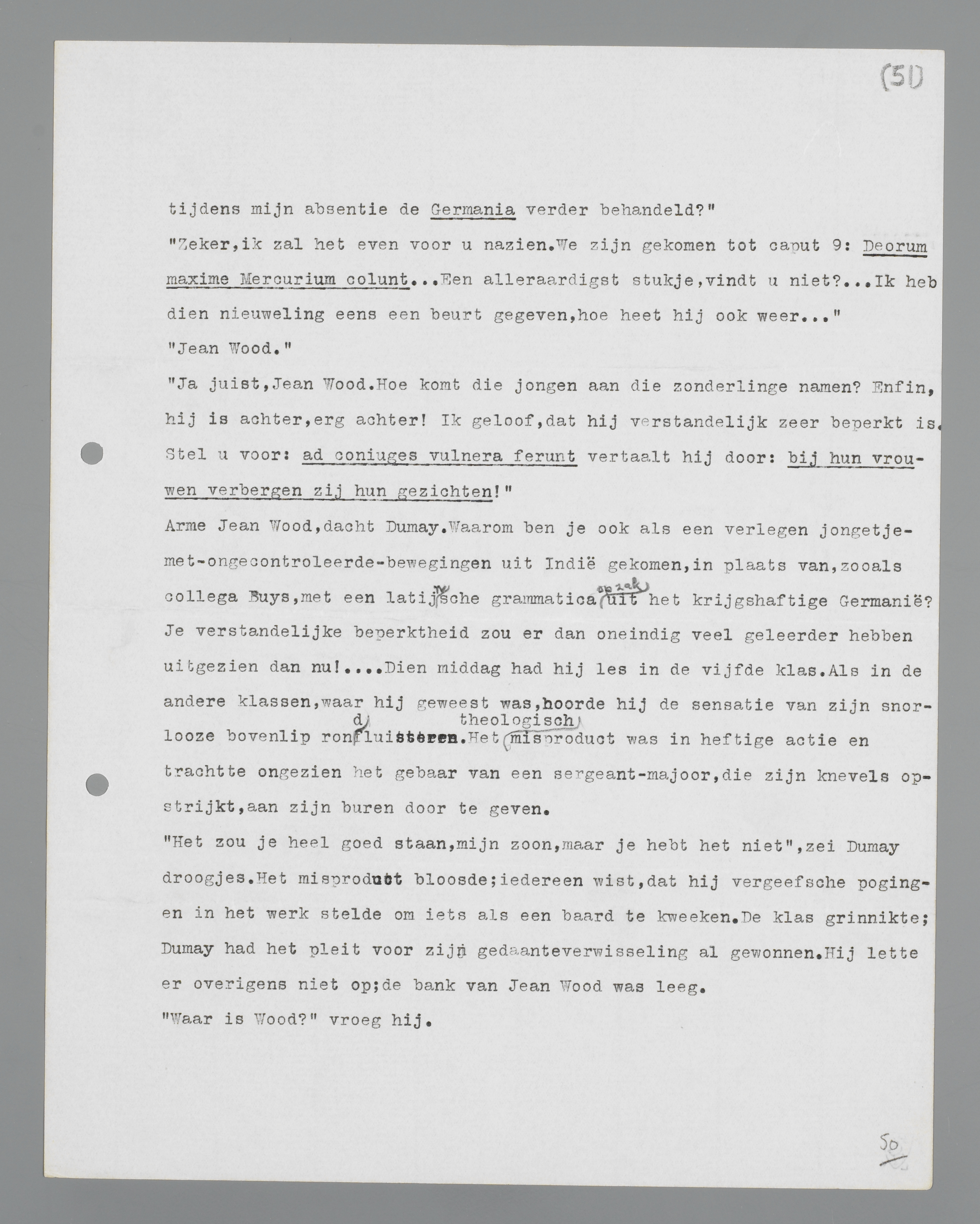 Arme Jean Wood, dacht Dumay. Waarom ben je ook als een verlegen jongetje-met-ongecontroleerde-bewegingen uit Indië gekomen, in plaats van zoals collega Buys, met een latijnse grammatica op zak uit het krijgshaftige Germanië? Je verstandelijke beperktheid zou er dan oneindig veel geleerder hebben uitgezien dan nu! ... Die middag had hij les in de vijfde klas. Als in de andere klassen, waar hij geweest was, hoorde hij de sensatie van zijn snorloze bovenlip rondfluisteren. Het theologisch misproduct was in heftige actie en trachtte ongezien het gebaar van een sergeant-majoor, die zijn knevels opstrijkt, aan zijn buren door te geven.
