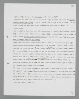 ‘Het zou je heel goed staan, mijn zoon, maar je hebt het niet,’ zei Dumay droogjes. Het misproduct bloosde; iedereen wist, dat hij vergeefse pogingen in het werk stelde om iets als een baard te kweken. De klas grinnikte; Dumay had het pleit voor zijn gedaanteverwisseling al gewonnen. Hij lette er overigens niet op; de bank van Jean Wood was leeg.