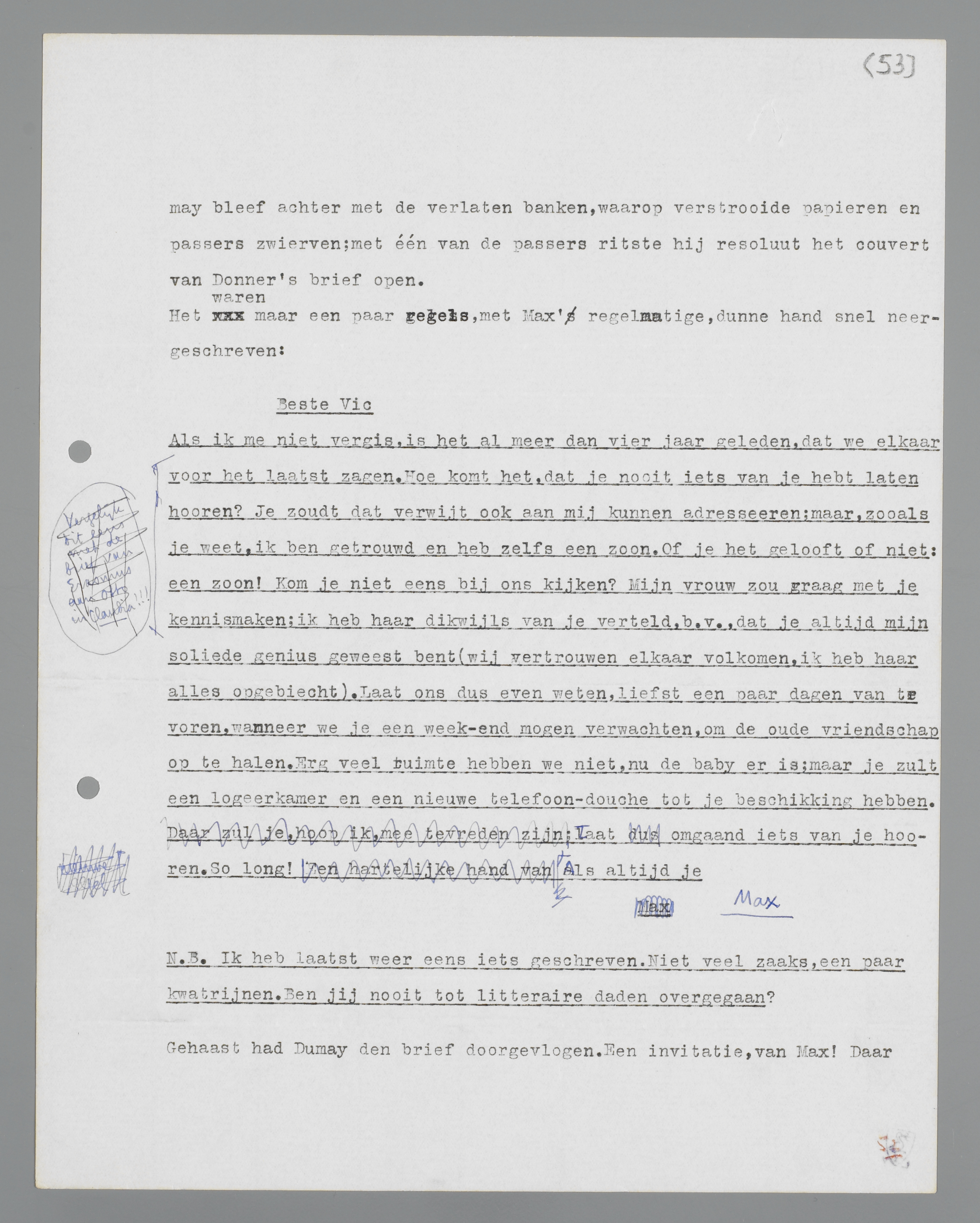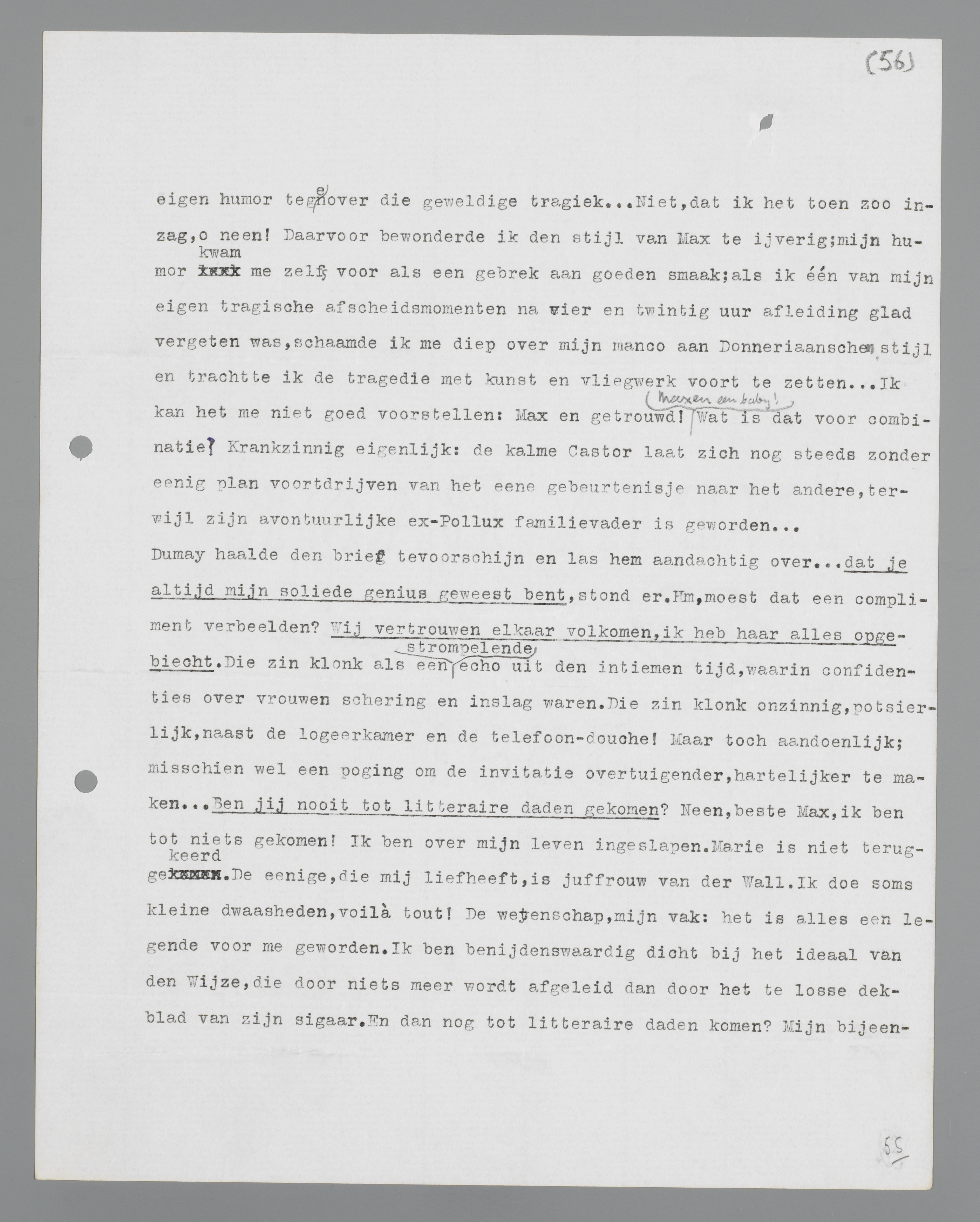 van mijn eigen rust, mijn eigen humor tegenover die geweldige tragiek. ... Niet, dat ik het toen zo inzag, o neen! Daarvoor bewonderde ik de stijl van Max te ijverig; mijn humor kwam me zelfs voor als een gebrek aan goede smaak; als ik één van mijn eigen tragische afscheidsmomenten na vier en twintig uur afleiding glad vergeten was, schaamde ik me diep over mijn manco aan Donneriaanse stijl en trachtte ik de tragedie met kunst en vliegwerk voort te zetten. ... Ik kan het me niet goed voorstellen: Max en getrouwd! Max en een baby! Wat is dat voor combinatie? Krankzinnig eigenlijk: de kalme Castor laat zich nog steeds stuurloos voortdrijven van het ene gebeurtenisje naar het andere, terwijl zijn avontuurlijke ex-Pollux familievader is geworden. ...