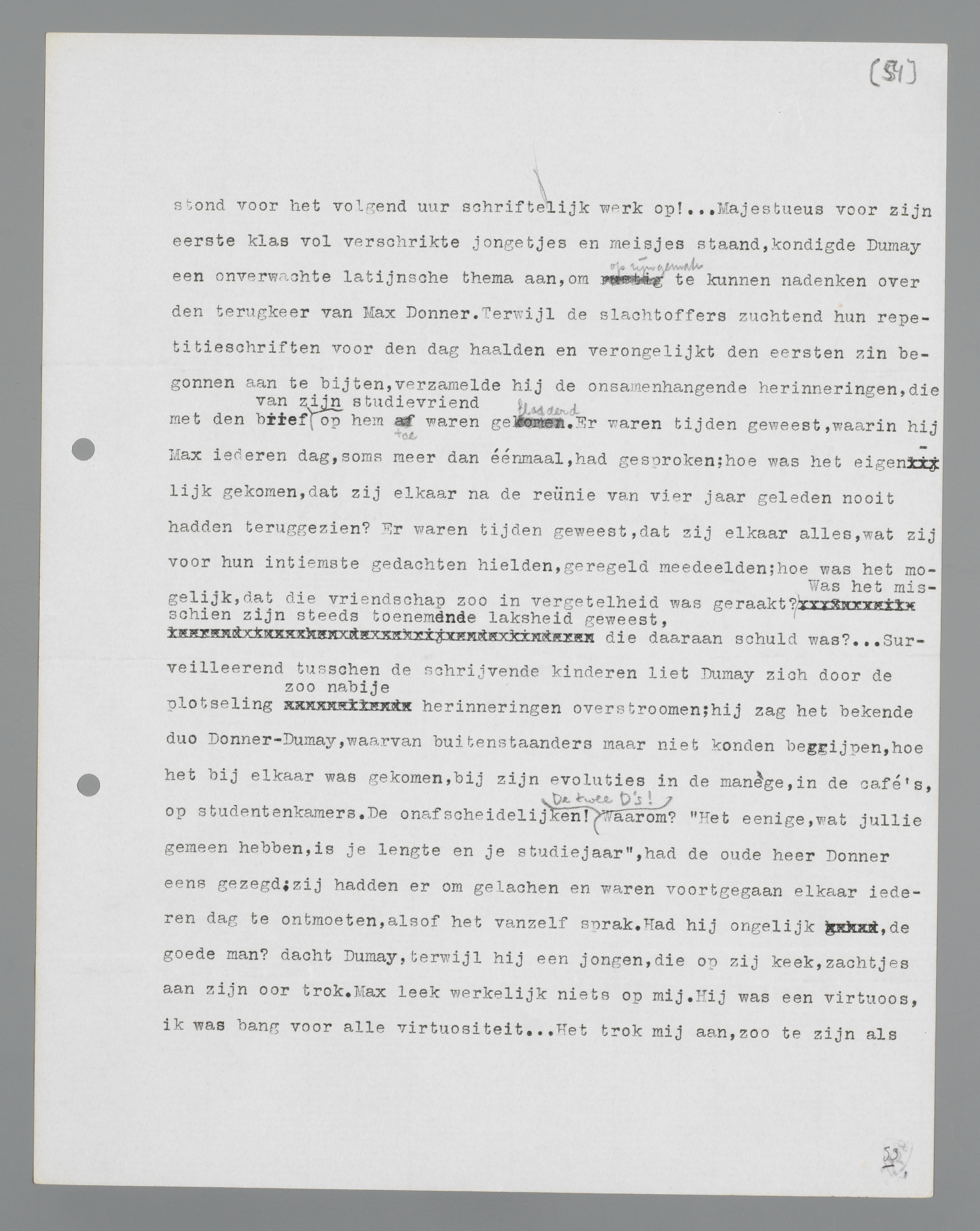 hoe het bij elkaar was gekomen, bij zijn evoluties in de manege, in de café's, op studentenkamers. De onafscheidelijken! De twee D's! Waarom? ‘Het enige, wat jullie gemeen hebben, is je lengte en je studiejaar,’ had de oude heer Donner eens gezegd; zij hadden er om gelachen en waren voortgegaan elkaar iedere dag te ontmoeten, alsof het vanzelf sprak. Had hij ongelijk, de goede man? dacht Dumay, terwijl hij een jongen, die op zij keek, zachtjes aan zijn oor trok. Max leek werkelijk niets op mij. Hij was een virtuoos, ik was bang voor alle virtuositeit. Het trok mij aan, zo te zijn als hij, maar ik had er niet het geringste talent voor. Mijn hele leven, geloof ik, wordt bepaald door mijn traagheid. ... Max daarentegen! Hoe perfect schermde hij, reed hij paard! Tot zijn oude heer failliet ging; toen was het daarmee uit, en ik was heimelijk blij, dat ik ook met goed fatsoen van de sport af kon komen; dat herinner ik me nog goed. ... Volgende episode: Max redacteur van het studentenblad. Hij styleerde dadelijk uitstekend, en kon dadelijk met flair over alles schrijven, hoewel hij het vroeger zelden gedaan had. Curieus; wat was ik afgunstig op die flair! Ik was er eigenlijk van overtuigd, dat ik betere ideeën had dan hij; maar wat zijn ideeën zonder flair? Ideeën zonder flair behoren waarschijnlijk bij mijn constitutie; daarom was ik juist goed genoeg om een lijvige dissertatie in elkaar te zetten. Twee of drie maal schreef ik iets, op Max' verzoek; het leek ook wel wat, het was niet slecht, maar ik schaam me nog, als ik er aan terugdenk: het was zijn stijl! Ik had er ook geen behoefte aan, die dingen te schrijven; ik had er alleen behoefte aan, op wandelingen slordig te denken, hier en daar wat te grijpen aan gedachten, dan weer te lezen, dan weer niets te doen. ... Hij had nooit rust, ik was, zelfs in tijdelijke onrust, voortdurend rustig. Hoeveel liefdesgeschiedenissen heb ik niet van hem meegemaakt! Telkens weer hele drama's, verschrikkelijke tragedies; om Liesje, om Suzanne, om mevrouw Marez, die hij tot scheiding wou overhalen; mijn hemel ja, dat is waar ook! Gelukkig voor hem, dat zij haar twee dienstboden en haar mooie grijze wagen boven die oplossing prefereerde. En ik, die er altijd zo dilettantisch bij stond, trachtend zijn stijl te vinden, maar hopeloos overtuigd