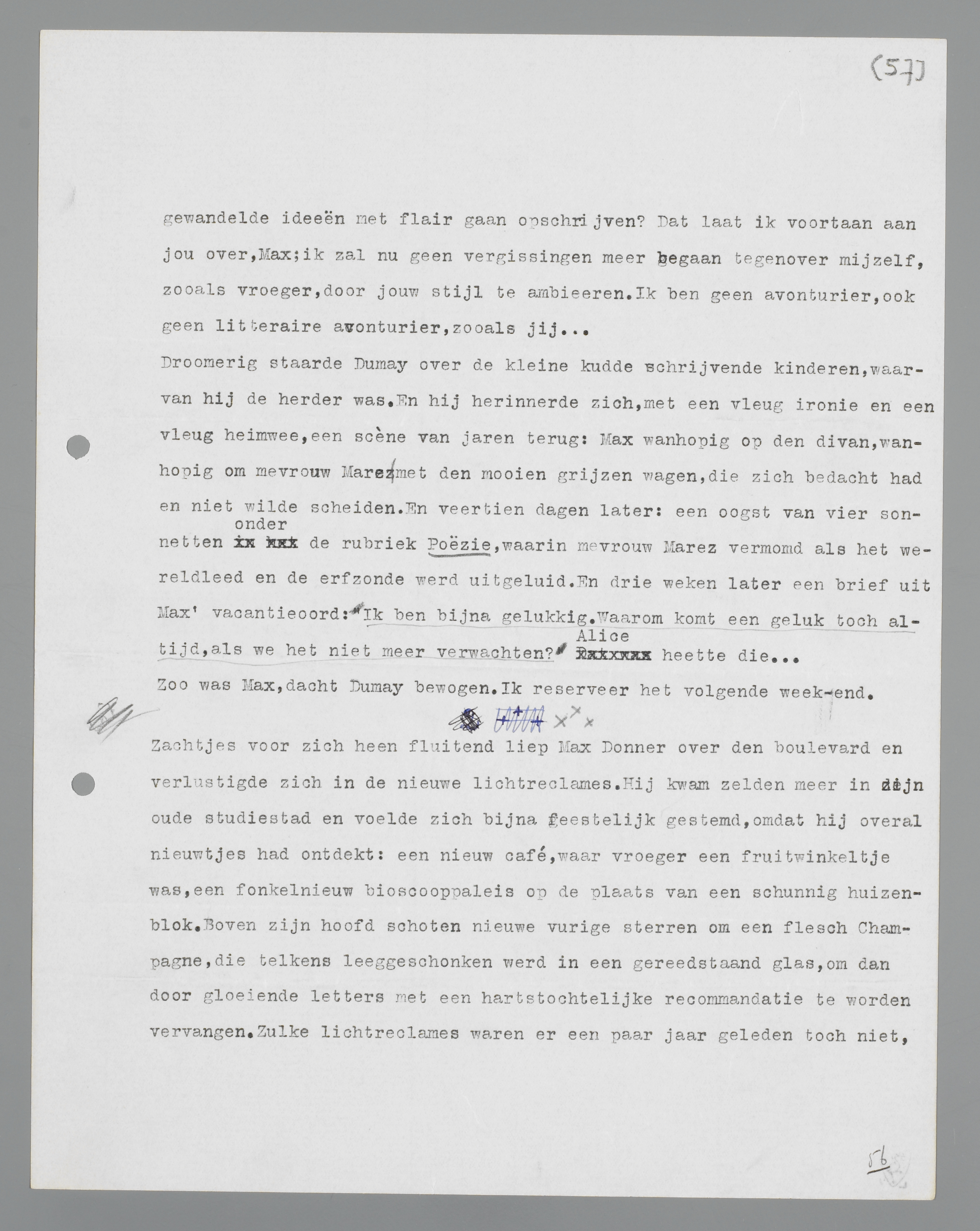 ren terug: Max wanhopig op de divan, wanhopig om mevrouw Marez met de mooie grijze wagen, die zich bedacht had en niet wilde scheiden. En veertien dagen later: een oogst van vier sonnetten onder de rubriek Poëzie, waarin mevrouw Marez vermomd als het wereldleed en de erfzonde werd uitgeluid. En drie weken later een brief uit Max' vacantieoord: Ik ben bijna gelukkig. Waarom komt een geluk toch altijd, als we het niet meer verwachten? Alice heette die. ...