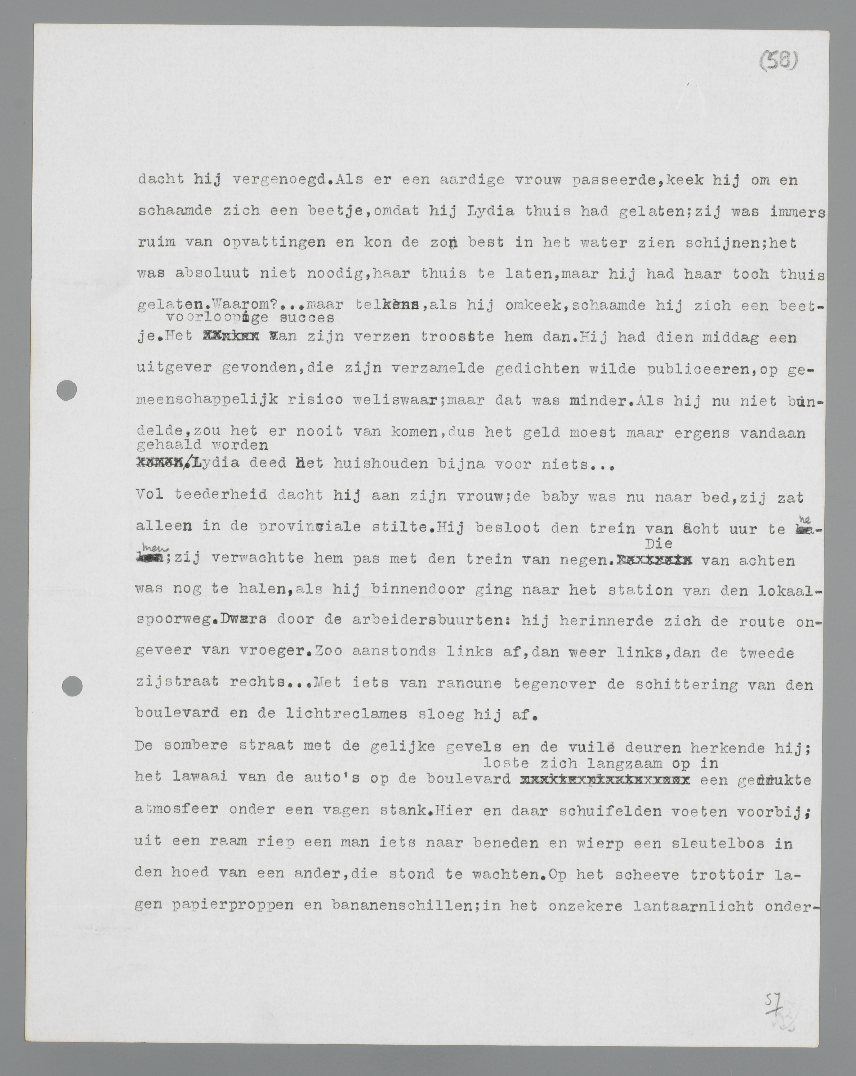 Vol tederheid dacht hij aan zijn vrouw; de baby was nu naar bed, zij zat alleen in de provinciale stilte. Hij besloot de trein van acht uur te halen, binnendoor naar het station van de locaalspoorweg. Dwars door de arbeidersbuurten: hij herinnerde zich de route ongeveer van vroeger. Zo aanstonds links af, dan weer links, dan de tweede zijstraat rechts. ... Met iets van rancune tegenover de schittering van de boulevard en de lichtreclames sloeg hij af.