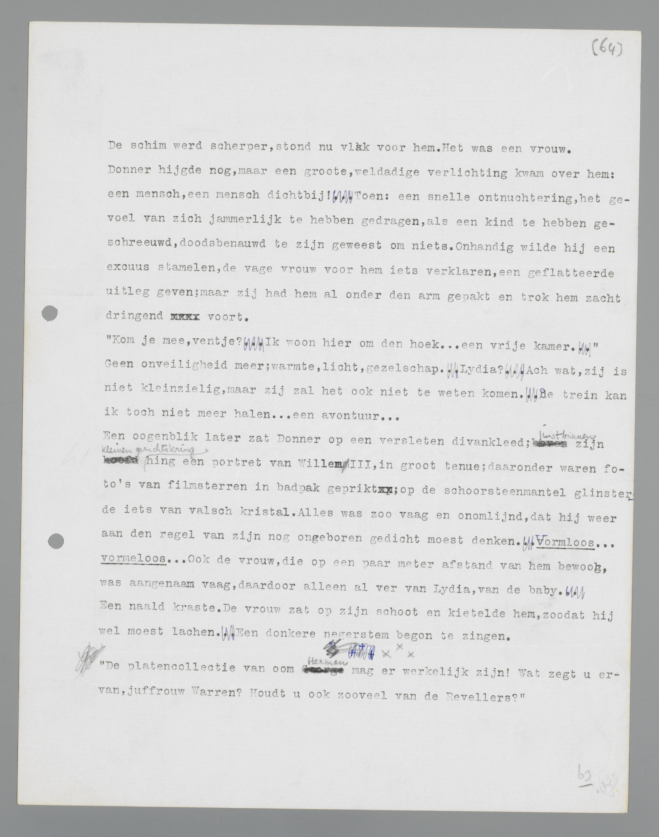 Een ogenblik later zat Donner op een versleten divankleed; juist binnen zijn kleine gezichtskring hing een portret van Willem III, in groot tenue; daaronder waren foto's van filmsterren in badpak geprikt; op de schoorsteenmantel glinsterde iets van vals kristal. Alles was zo vaag en onomlijnd, dat hij weer aan de regel van zijn nog ongeboren gedicht moest denken. Vormloos ... vormeloos. ... Ook de vrouw, die op een paar meter afstand van hem bewoog, was aangenaam vaag, daardoor alleen al ver van Lydia, van de baby. Een naald kraste. De vrouw zat op zijn schoot en kietelde hem, zodat hij wel moest lachen. Een donkere negerstem begon te zingen.