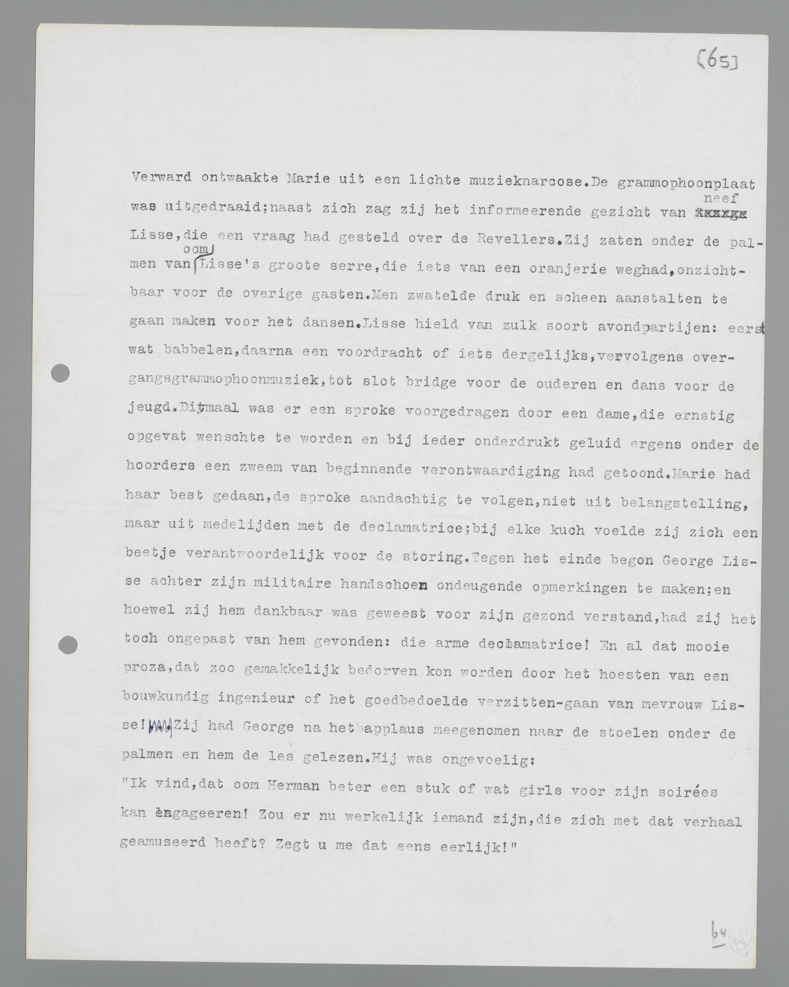Verward ontwaakte Marie uit een lichte muzieknarcose. De gramophoonplaat was uitgedraaid; naast zich zag zij het informerende gezicht van neef Lisse, die een vraag had gesteld over de Revellers. Zij zaten onder de palmen van oom Lisse's grote serre, die iets van een oranjerie weghad, onzichtbaar voor de overige gasten. Men zwatelde druk en scheen aanstalten te gaan maken voor het dansen. Lisse hield van zulk soort avondpartijen: eerst wat babbelen, daarna een voordracht of iets dergelijks, vervolgens overgangsgramophoonmuziek, tot slot bridge voor de ouderen en dans voor de jeugd. Ditmaal was er een sproke voorgedragen door een dame, die ernstig opgevat wenste te worden en bij ieder onderdrukt geluid ergens onder de hoorders een zweem van beginnende verontwaardiging had getoond. Marie had haar best gedaan, de sproke aandachtig te volgen, niet uit belangstelling, maar uit medelijden met de declamatrice; bij elke kuch voelde zij zich een beetje verantwoordelijk voor de storing. Tegen het einde begon George Lisse achter zijn militaire handschoen ondeugende opmerkingen te maken; en hoewel zij hem dankbaar was geweest voor zijn gezond verstand, had zij het toch ongepast van hem gevonden: die arme declamatrice! En al dat mooie proza, dat zo gemakkelijk bedorven kon worden door het hoesten van een bouwkundig ingenieur of het goedbedoelde verzitten-gaan van mevrouw Lisse! Zij had George na het applaus meegenomen naar de stoelen onder de palmen en hem de les gelezen. Hij was ongevoelig: