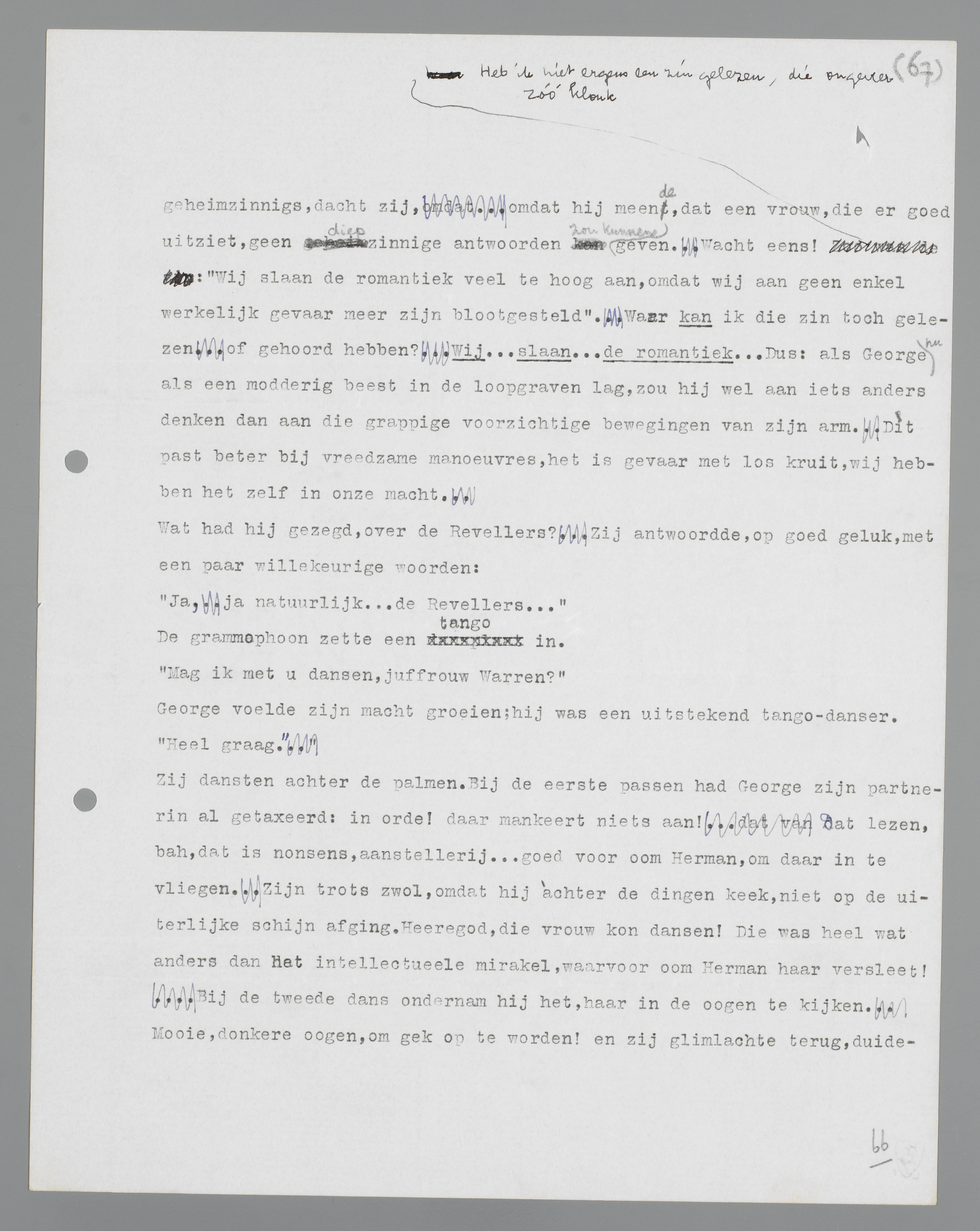 Stil liet Marie zijn bewondering met de muziek over zich komen; het was prettig, bewonderd en bemusiceerd te worden. George Lisse ziet in mij iets geheimzinnigs, dacht zij, omdat hij meende, dat een vrouw, die er goed uitziet, geen diepzinnige antwoorden zou kunnen geven. Wacht eens! Heb ik niet ergens een zin gelezen, die ongeveer zó klonk: Wij slaan de romantiek veel te hoog aan, omdat wij aan geen enkel werkelijk gevaar meer zijn blootgesteld. Waar kan ik die zin toch gelezen of gehoord hebben? Wij ...slaan ... de romantiek... Dus: als George nu als een modderig beest in de loopgraven lag, zou hij wel aan iets anders denken dan aan die grappige voorzichtige bewegingen van zijn arm. Dìt past beter bij vreedzame manoeuvres, het is gevaar met los kruit, wij hebben het zelf in onze macht.