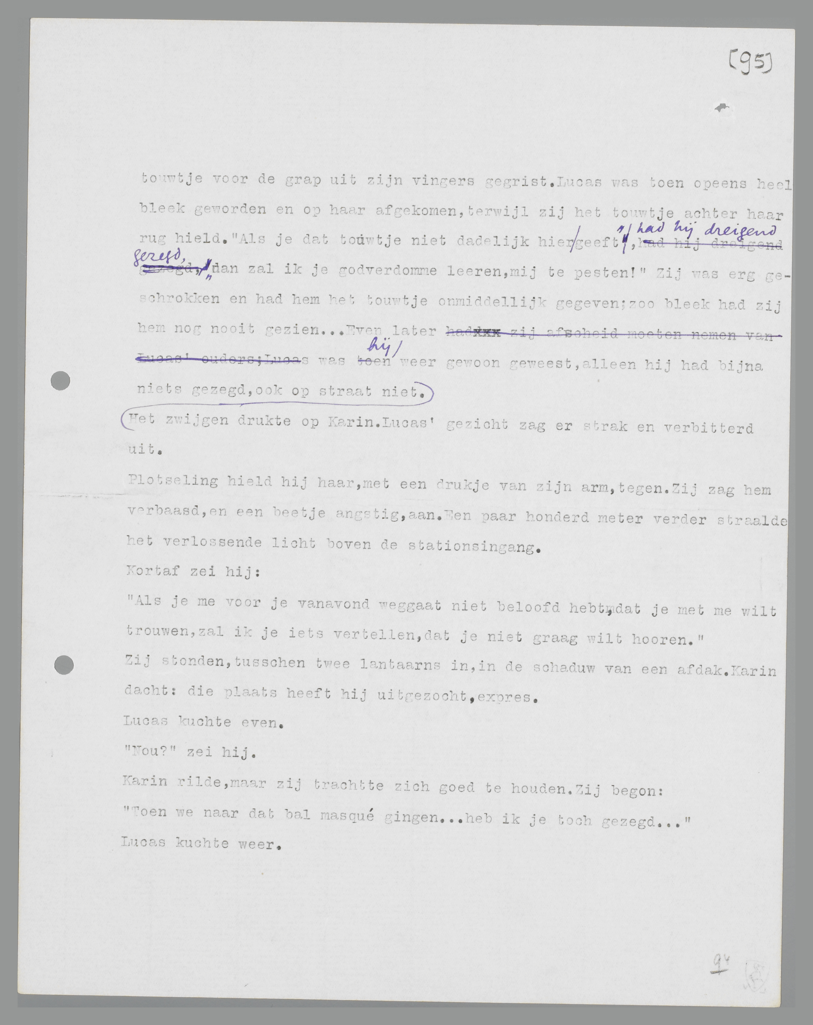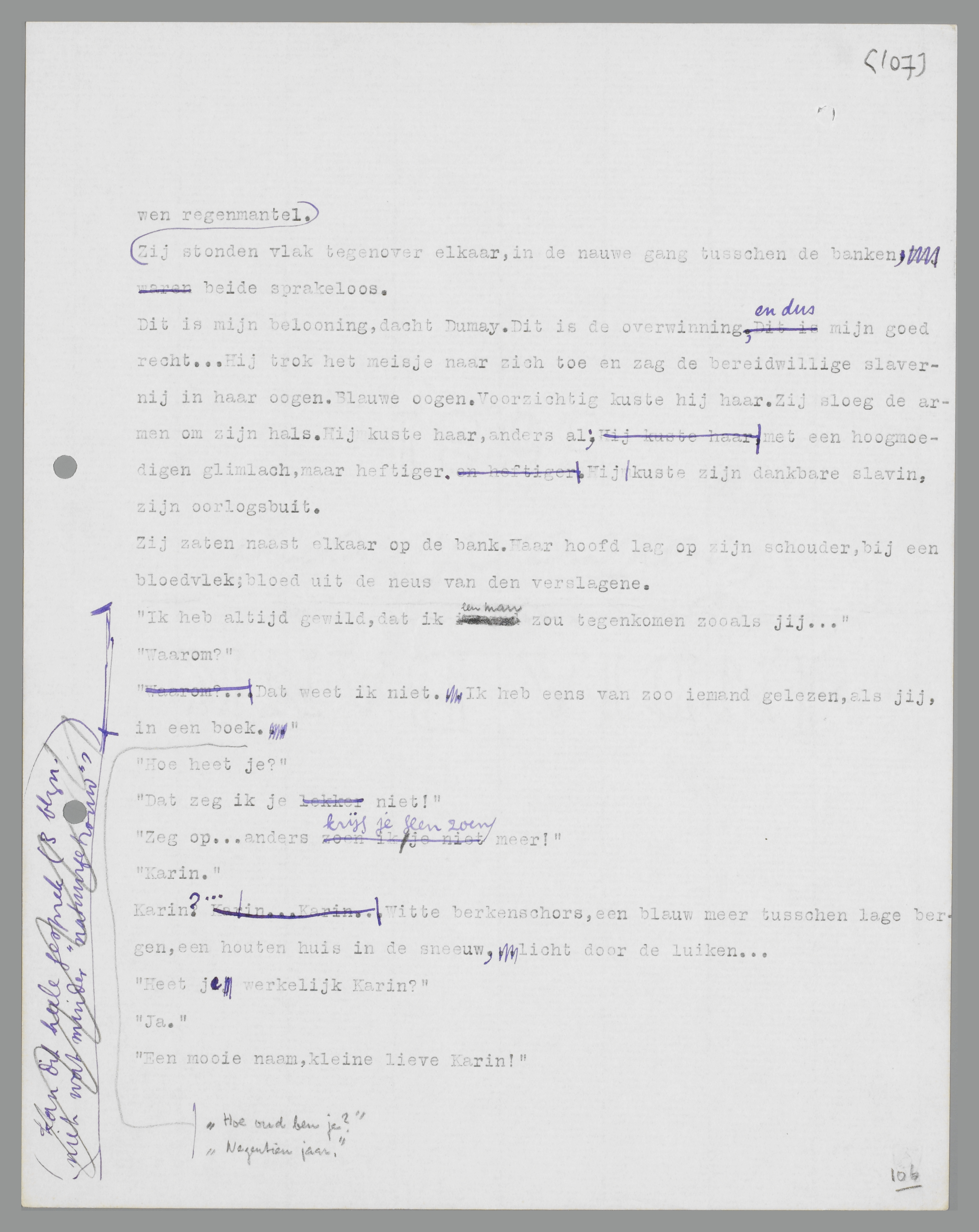 Als Lucas over trouwen begon, werd Karin altijd erg zenuwachtig. Zij wilde niet met hem trouwen, maar zij was reeds te ver gegaan, om hem dat nog aan zijn verstand te kunnen brengen; daarom ging zij nu al maanden met hem naar bals en bioscopen zonder dat er een beslissing viel. Dansen en naar een film kijken bleef prettig; maar een groot deel van het pleizier werd bedorven door het vooruitzicht op Lucas' aandringen na afloop. Hij wilde weten, waar hij aan toe was, zei hij dan. Was hij eenmaal op het trouwen gekomen, dan was hij er niet meer van af te brengen. Soms zanikte hij een half uur achter elkaar; vaak werd hij nijdig en vloekte, zodat zij de grootste moeite had, hem weer kalm te krijgen. Eens was hij weggelopen en had geschreeuwd dat hij nooit meer iets met haar te maken wilde hebben. Zij had zich toen toch wel ellendig gevoeld, al was zij blij geweest, dat zij van hem af was; maar de volgende dag al kwam er een expresse-brief van hem op kantoor, om het weer bij te leggen; ingesloten waren twee toegangskaarten voor een bal masqué, en hij schreef, dat hij Zaterdag zou komen horen, of die twee kaarten door twee gelukkige mensen zouden worden gebruikt. Toen had zij weer niet kunnen weigeren; zo was er geen einde te zien. Lucas had alles voor haar over; hij maakte veel onkosten voor haar, hoewel hij zelf niet erg van feesten hield. Hij had eerst wel gedaan alsof; maar dat was in het begin geweest, toen alles anders leek. Toen was het alsof hij niets liever uitvoerde dan dansen, naar de bisocoop gaan, dansen, naar de bioscoop gaan; en dan elkaar lang in de ogen zien, elkaar over het haar strelen, gekke dingen zeggen, in het donker lopen, dicht tegen elkaar aan. Dat was in het begin. ... Het scheen haar nu, dat hij er toen ook anders uit had gezien en zich anders gedragen had. Zeker had hij toen ook wel eens over trouwen gesproken,