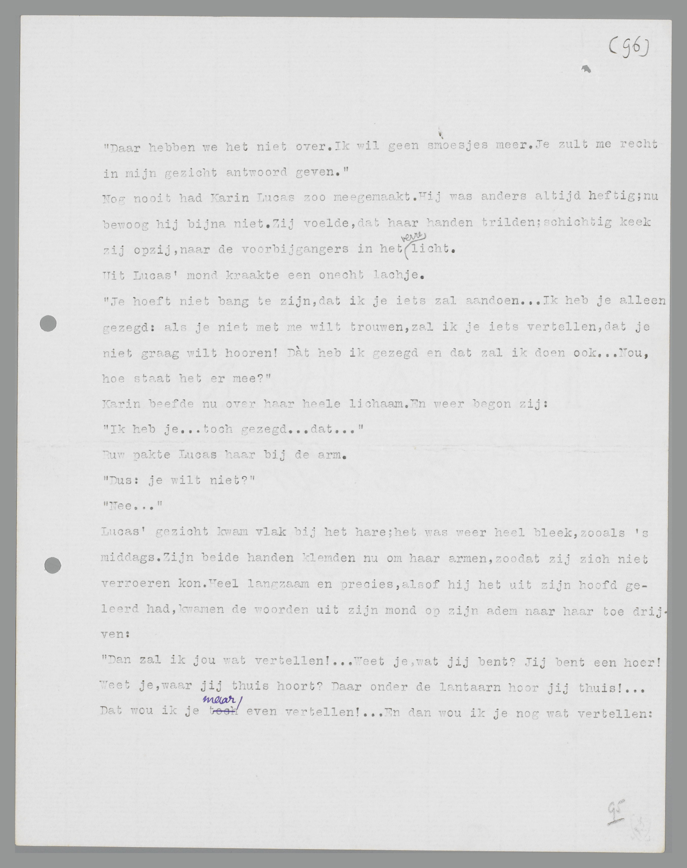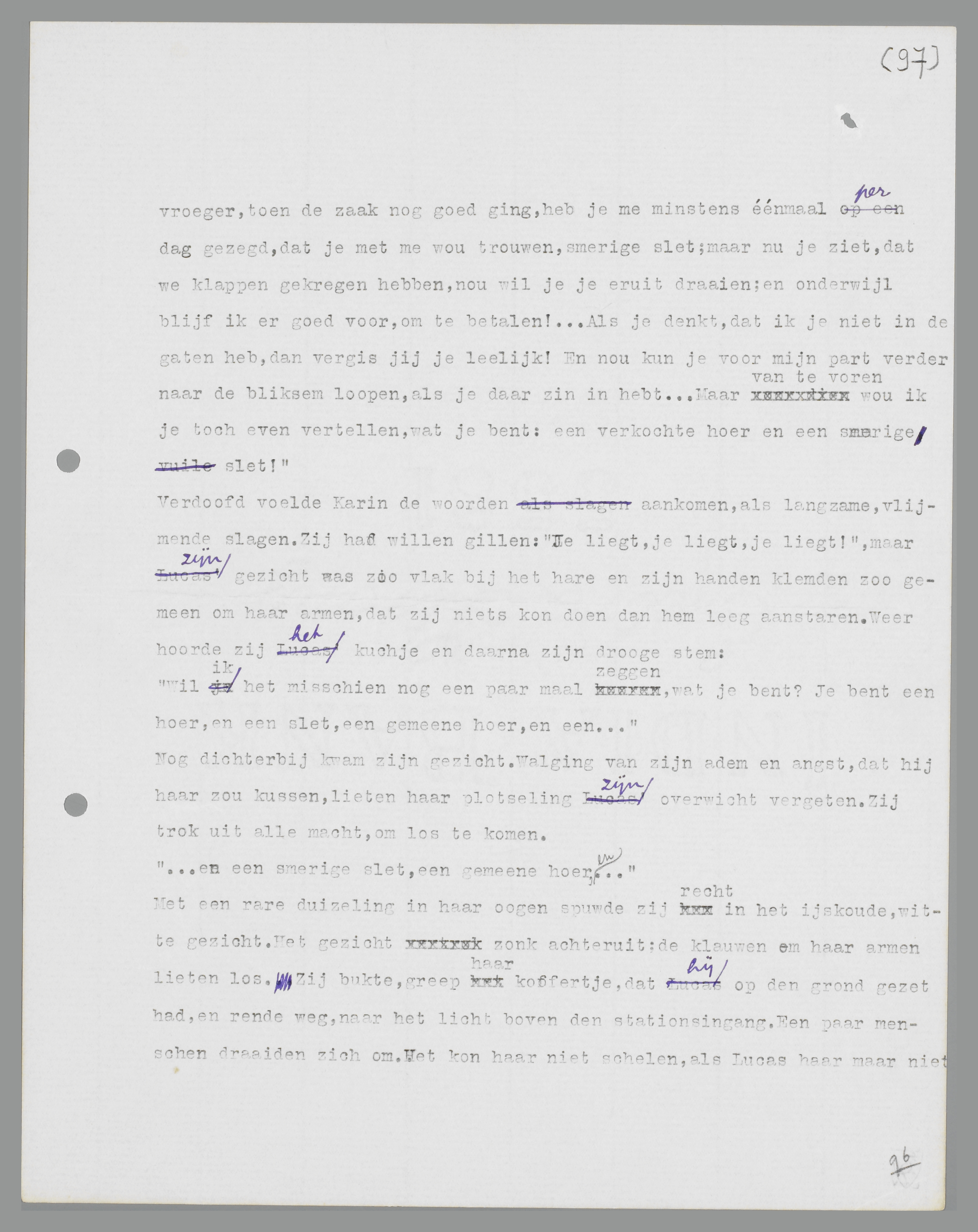 ‘Dan zal ik jou wat vertellen! Weet je, wat jij bent? Jij bent een hoer! Weet je, waar jij thuis hoort? Daar onder de lantaarn hoor jij thuis! ... Dat wou ik je maar even vertellen! ... En dan wou ik je nog wat vertellen: vroeger, toen de zaak nog goed ging, heb je me minstens éénmaal per dag gezegd, dat je met me wou trouwen, smerige slet; maar nu je ziet, dat we klappen gekregen hebben, nou wil je je eruit draaien; en onderwijl blijf ik er goed voor, om te betalen! Als je denkt, dat ik je niet in de gaten heb, dan vergis jij je lelijk! En nou kun je voor mijn part verder naar de bliksem lopen, als je daar zin in hebt. ... Maar van te voren wou ik je toch even vertellen, wat je bent: een verkochte hoer en een smerige slet!’