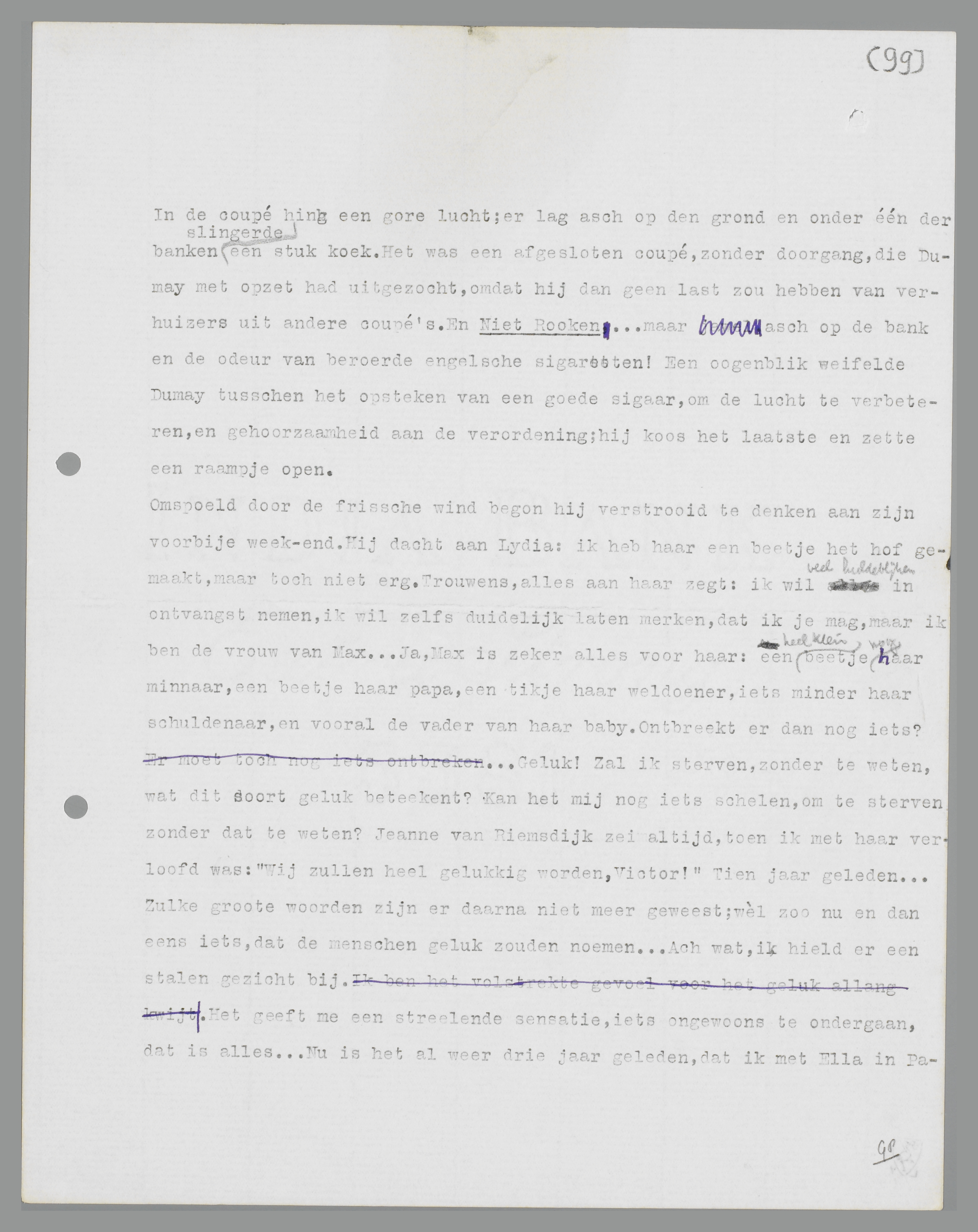 In de coupé hing een gore lucht; er lag as op de grond en onder één der banken slingerde een stuk koek. Het was een afgesloten coupé, zonder doorgang, die Dumay met opzet had uitgezocht, omdat hij dan geen last zou hebben van verhuizers uit andere coupé's. En Niet Roken ... maar as op de bank en de odeur van beroerde Engelse sigaretten! Een ogenblik weifelde Dumay tussen het opsteken van een goede sigaar, om de lucht te verbeteren, en gehoorzaamheid aan de verordening; hij koos het laatste en zette een raampje open.