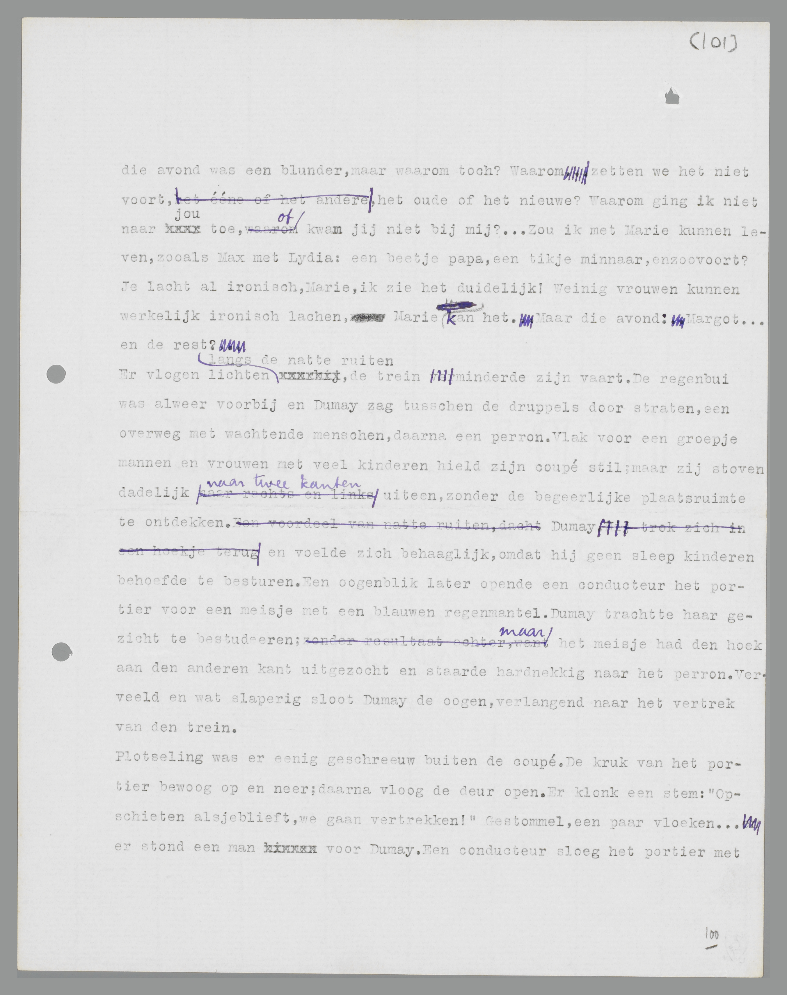 Er vlogen lichten langs de natte ruiten, de trein minderde zijn vaart. De regenbui was alweer voorbij en Dumay zag tussen de druppels door straten, een overweg met wachtende mensen, daarna een perron. Vlak voor een groepje mannen en vrouwen met veel kinderen hield zijn coupé stil; maar zij stoven dadelijk naar twee kanten uiteen, zonder de begeerlijke plaatsruimte te ontdekken. Dumay trok zich in een hoekje terug en voelde zich behaaglijk, omdat hij geen sleep kinderen behoefde te besturen. Een ogenblik later opende een conducteur het portier voor een meisje met een blauwe regenmantel. Dumay trachtte haar gezicht te bestuderen; maar het meisje had de hoek aan de andere kant uitgezocht en staarde hardnekkig naar het perron. Verveeld en wat slaperig sloot Dumay de ogen, verlangend naar het vertrek van de trein.