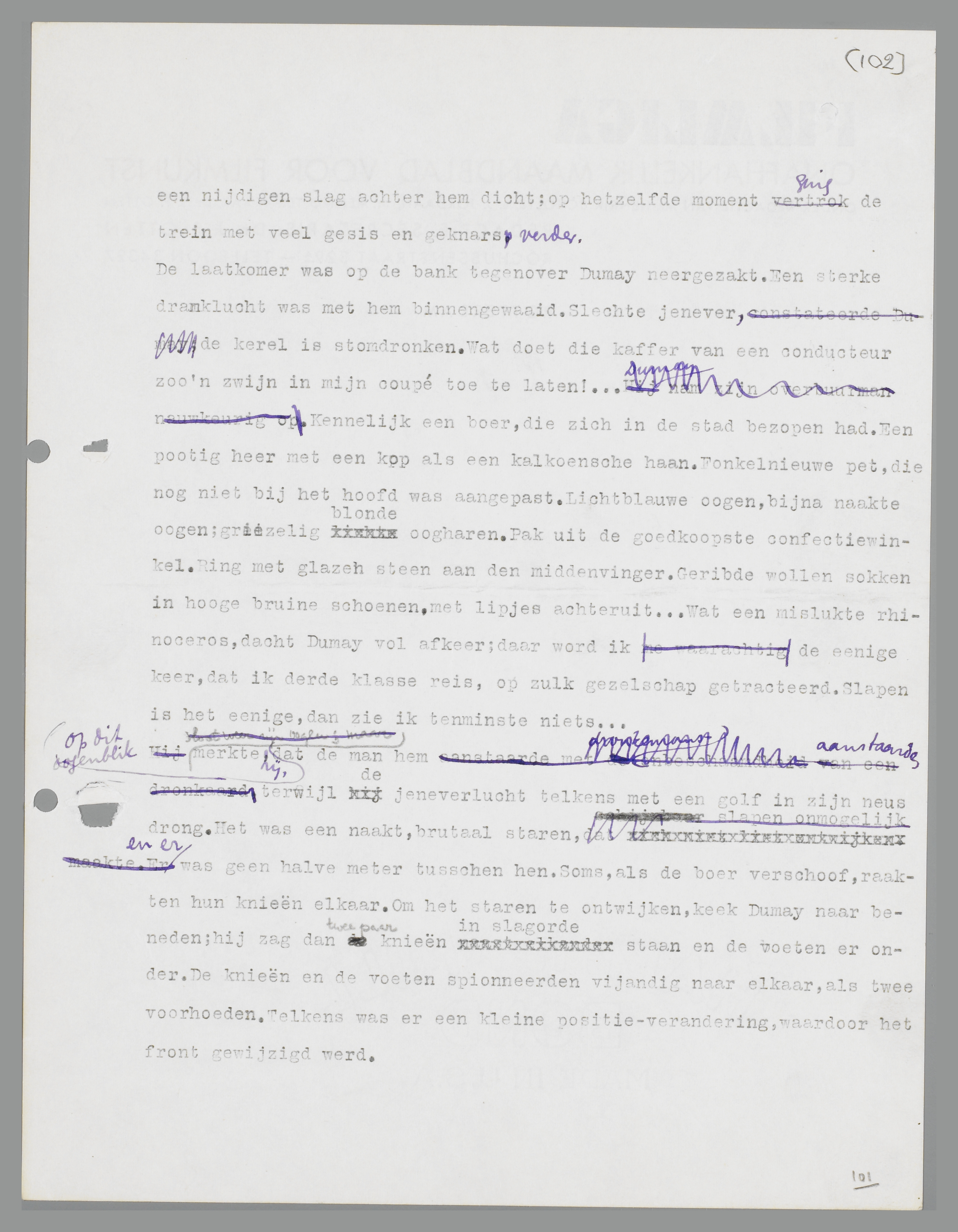 niet bij het hoofd was aangepast. Lichtblauwe ogen, bijna naakte ogen; griezelig blonde oogharen. Pak uit de goedkoopste confectiewinkel. Ring met glazen steen aan de middenvinger. Geribde wollen sokken in hoge bruine schoenen, met lipjes achteruit. ... Wat een mislukte rhinoceros, dacht Dumay vol afkeer; daar wordt ik de enige keer, dat ik derde klasse reis, op zulk gezelschap getracteerd. Slapen is het enige, dan zie ik ten minste niets. ...